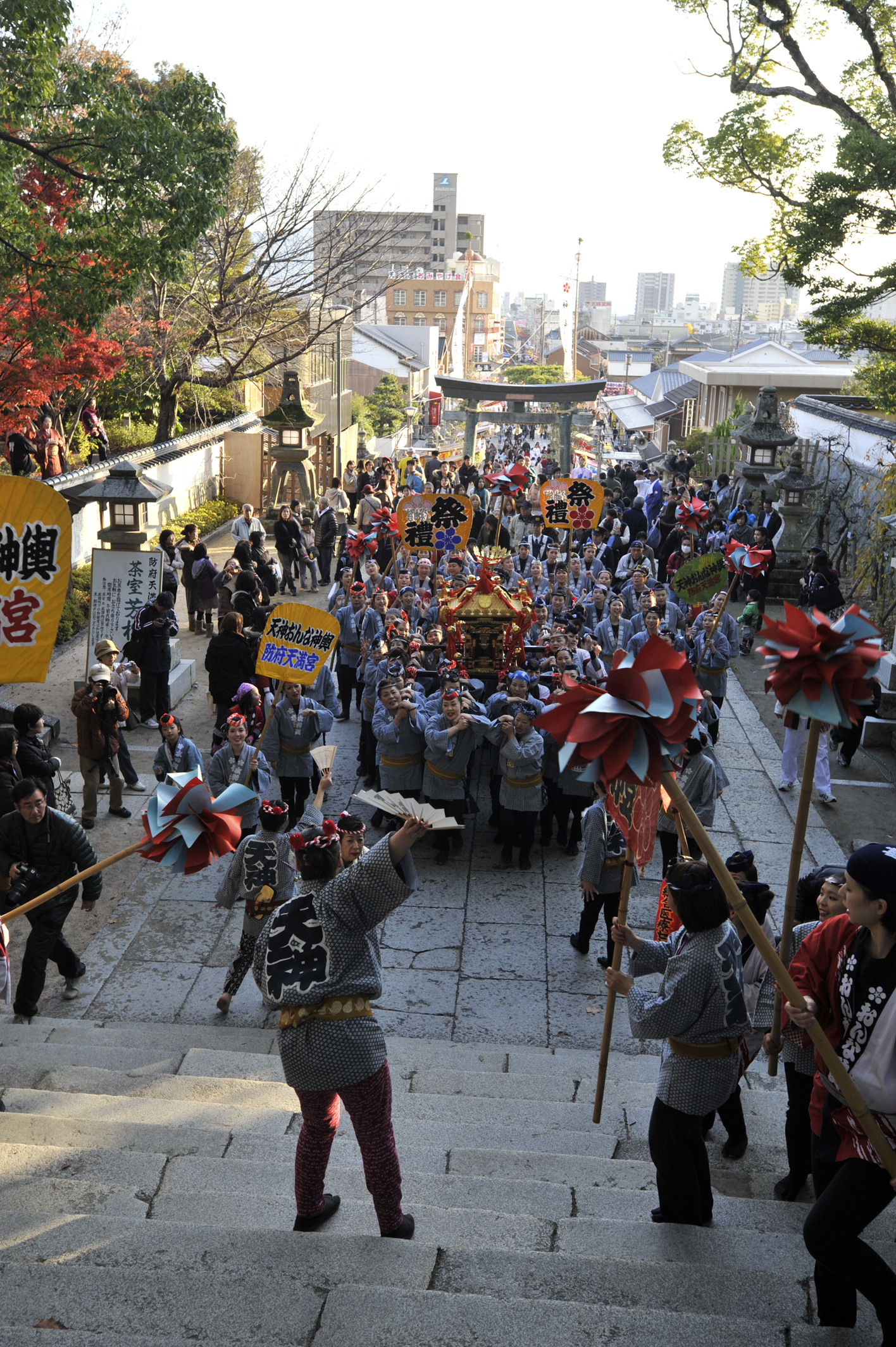 大祭の翌日は女性たちによる「天神おんな神輿」の出番です。県下から約200名の女性が集結し、お囃子車や大団扇などがはやし立てるなか、2基のお神輿を盛大に振りながら市内を練り歩きます。