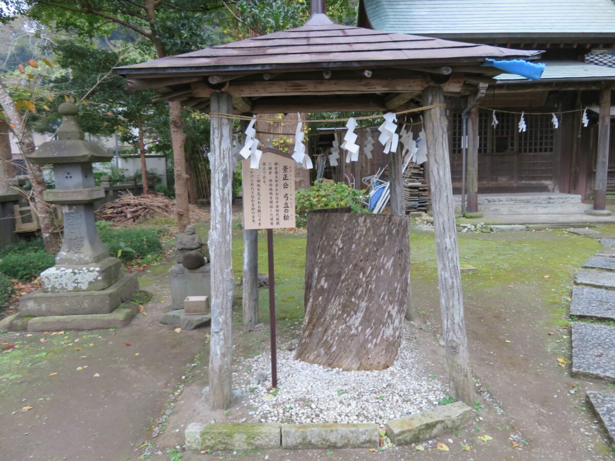 鎌倉景政は、源義家の奥州平定のための後三年の役に16歳で従軍し、矢で左眼を射抜かれながらも屈することなく勇敢に戦ったと伝わります。本殿の南には景政が領地を見回るときに弓を立てかけたと伝わる「弓立の松」が残っています。景正が手玉にとって、袂に入れたと言われる石にも目を引かれます。右の袂石は約60キロ、左の手玉石は約105キロの重さです。