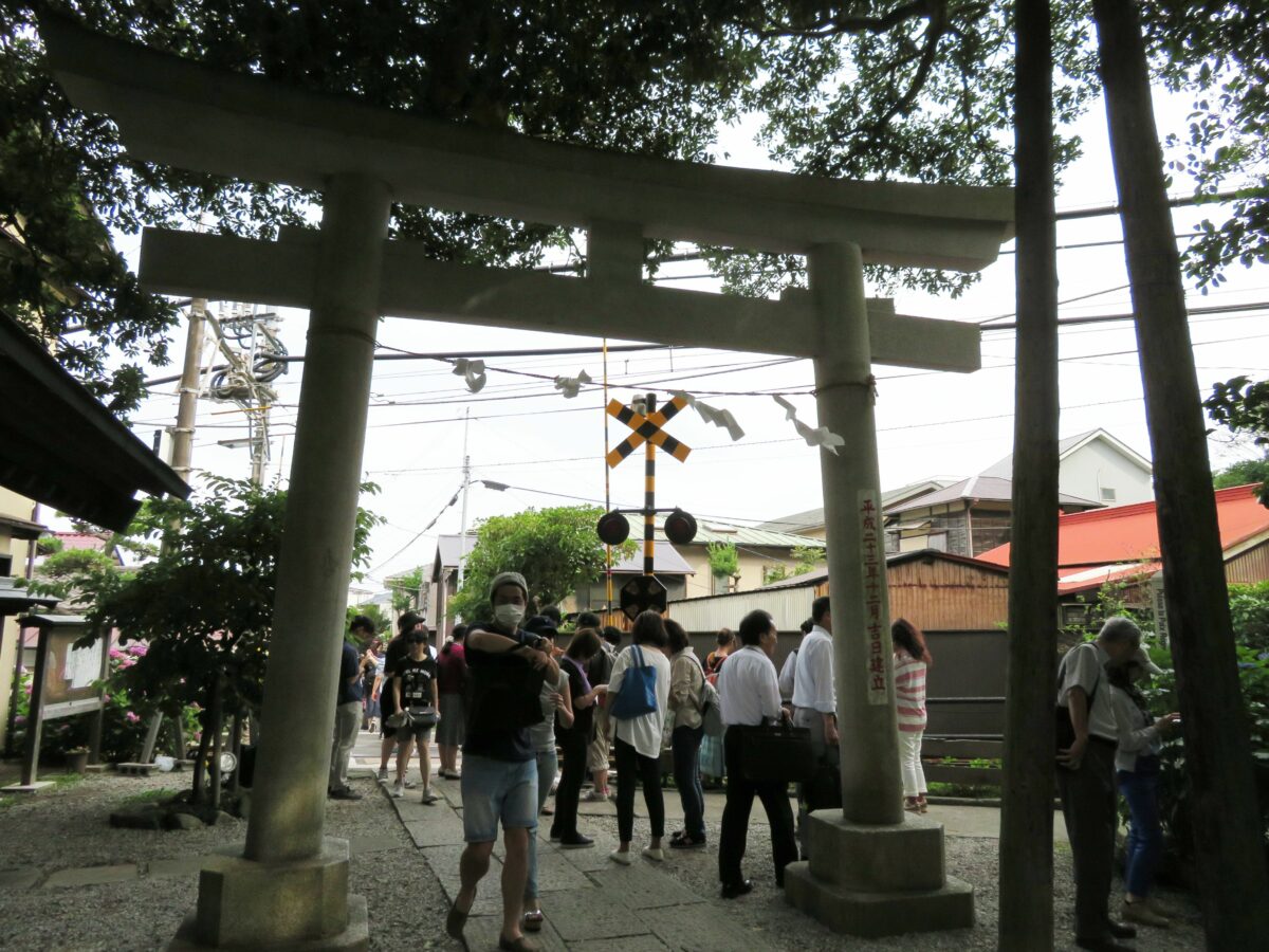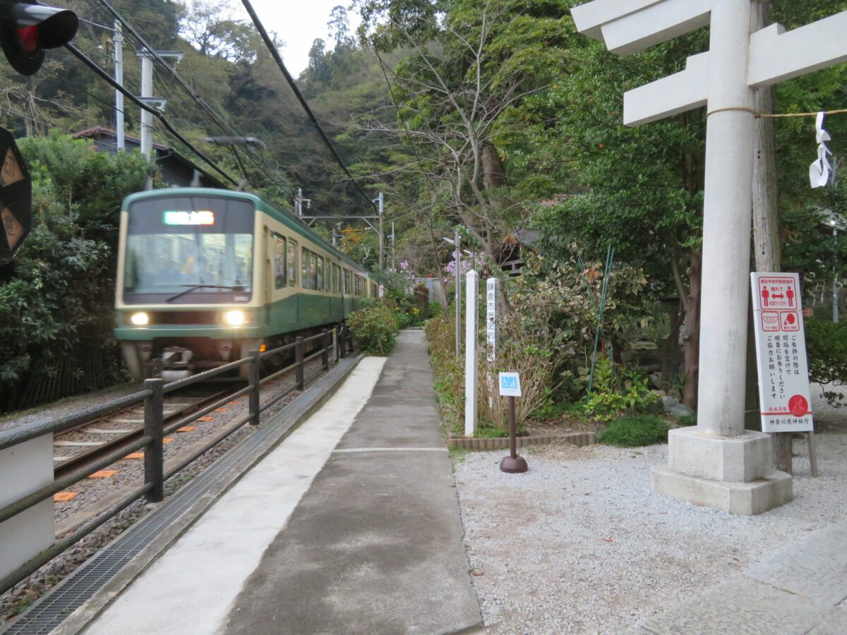 御霊神社では様々な景観を楽しむことができますが、珍しい光景が話題を呼んでいます。境内の南に接するように江ノ電の線路が敷かれているのです。鳥居の前を通過する江ノ電のレトロな車両の姿は、鎌倉でも屈指のフォトスポットとなっているのです。特に初夏には、線路に沿ってアジサイが花を咲かせ、カメラを手にした人々が詰めかけます。