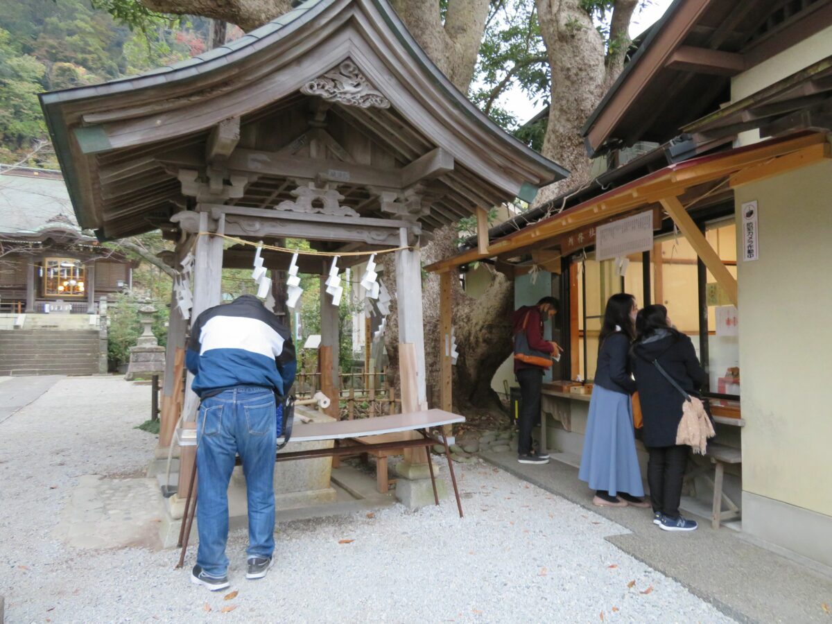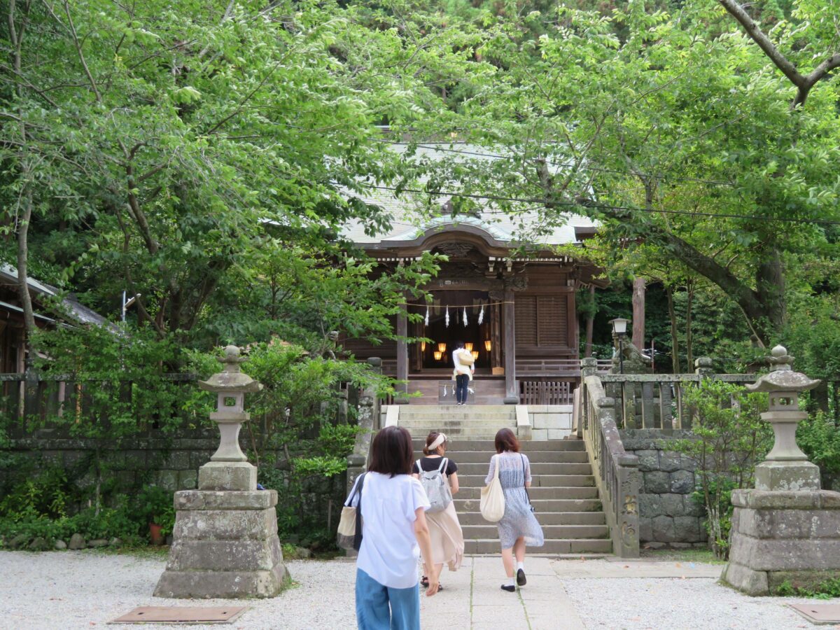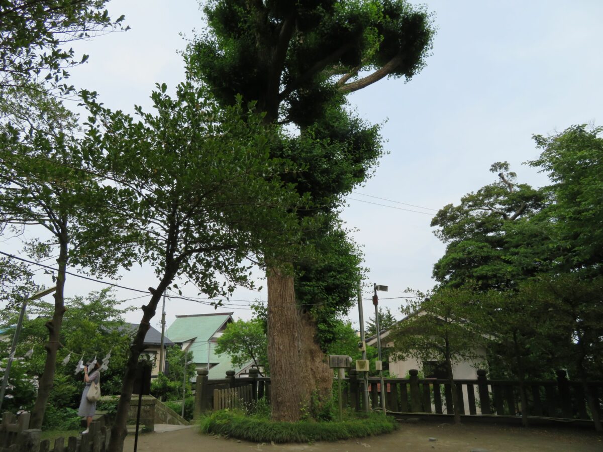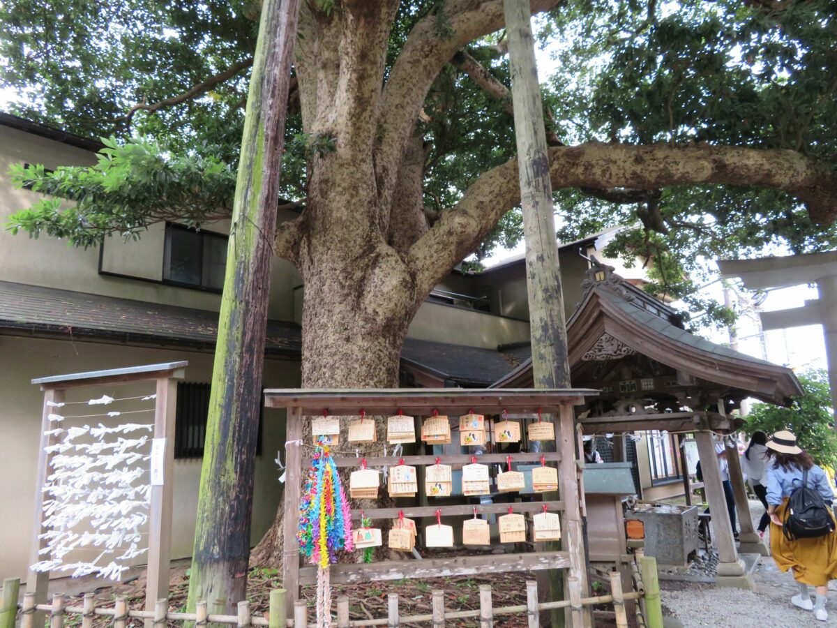 数々の社殿の間にはパワーを滾らせる樹木の姿を見ることができます。社務所の前に育つタブノキは樹齢350年と推定され、高さ約20メートルの幹からは、樹枝が冠状に広がります。夫婦銀杏には縁結びのご利益が期待できそうです。