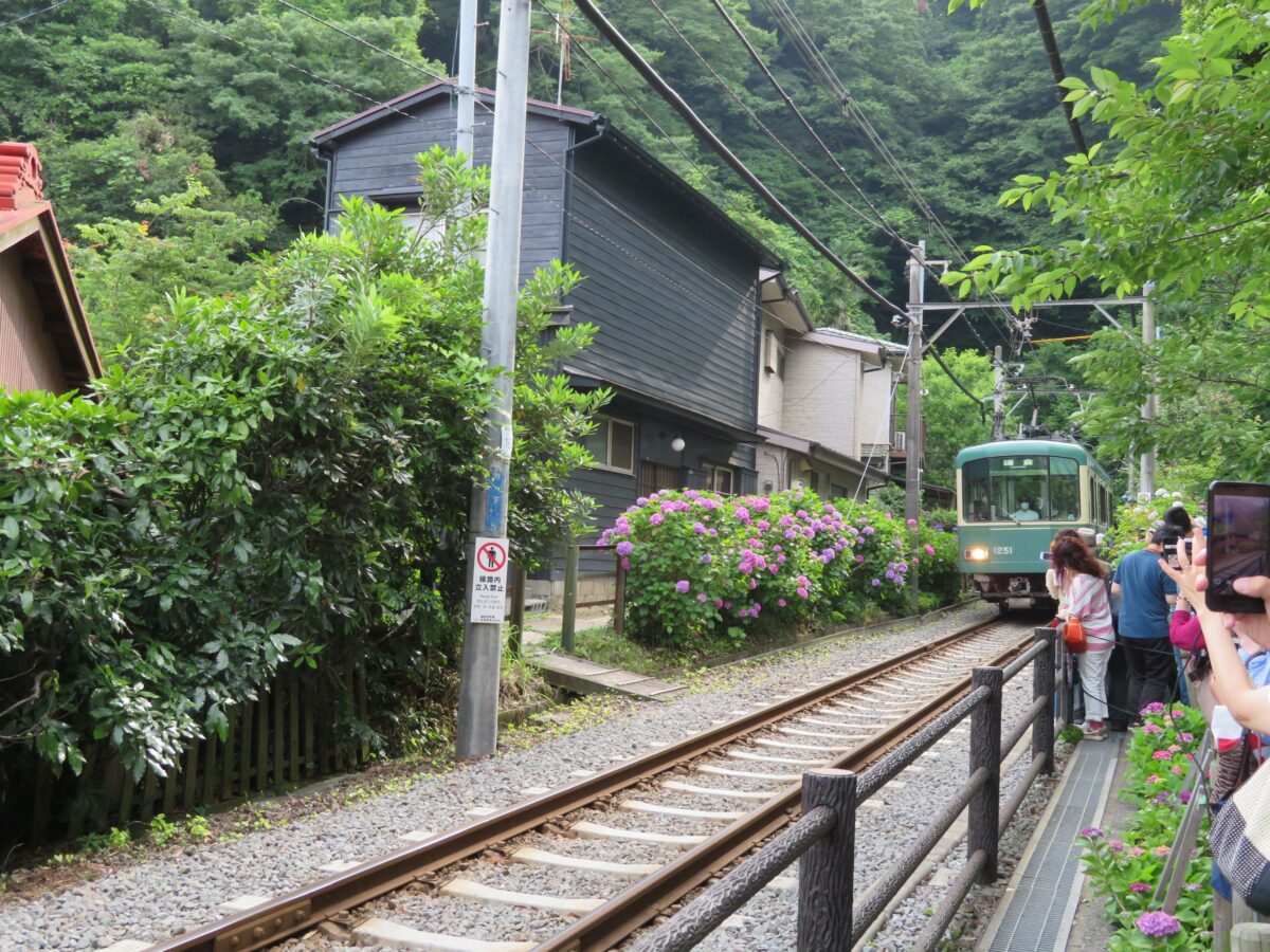 御霊神社に咲くアジサイに沿って走る江ノ電のレトロな車両