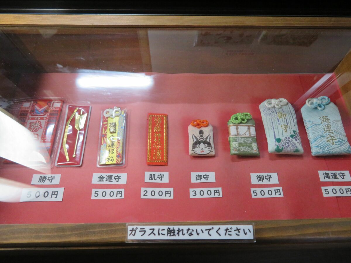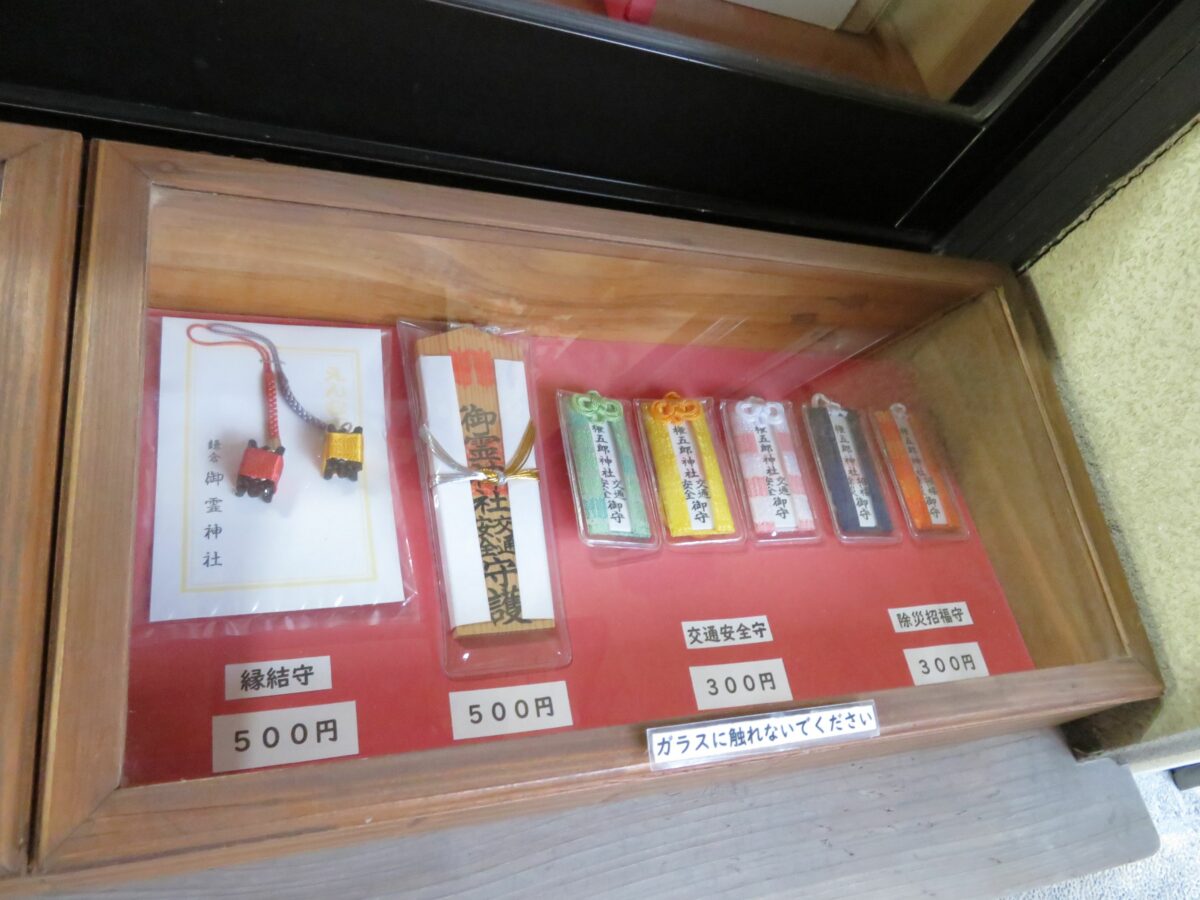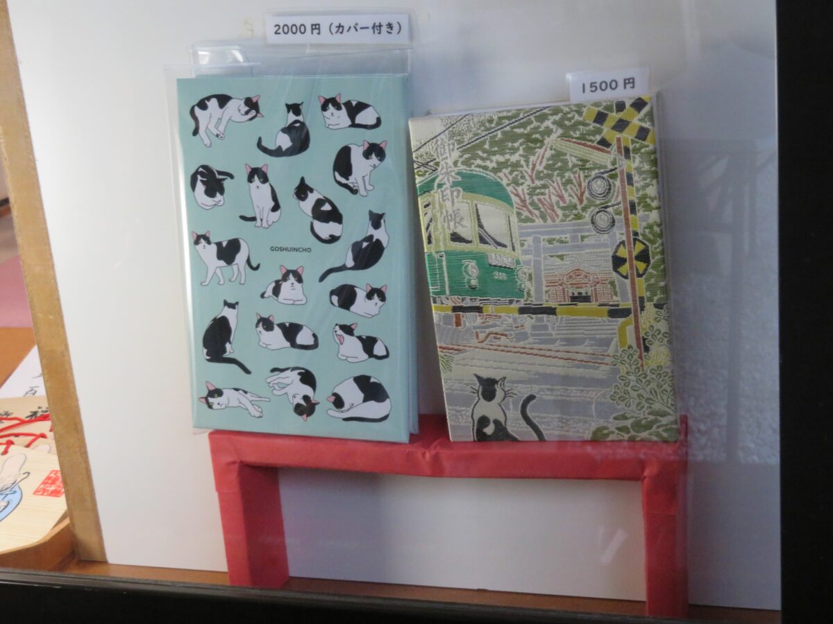 御霊神社では境内の南端に設けられた手水舎に隣接する社務所で御朱印を頂くことができます。御朱印ばかりでなく、オリジナルの御朱印帳も準備されており、鳥居の前を通過する江ノ電の車両を猫が眺めています。お守りや絵馬、土鈴などの授与品も種類豊富です。
