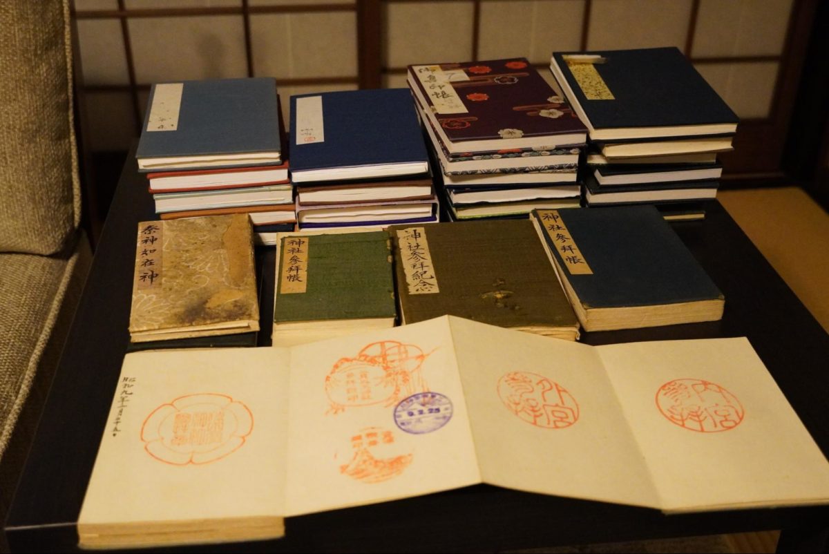 平林家で親子三代に渡って収集された御朱印の数々。古いものでは90年前の御朱印も。全国の有名神社の御朱印が多数あり、時代による変遷を辿ることも可能。