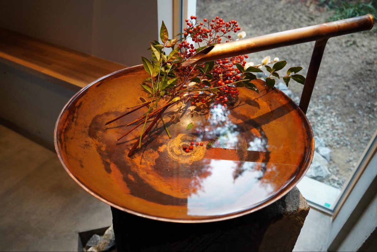 モダンな手水鉢には季節の花木が。授与所の内装はまるでアートギャラリーのよう。