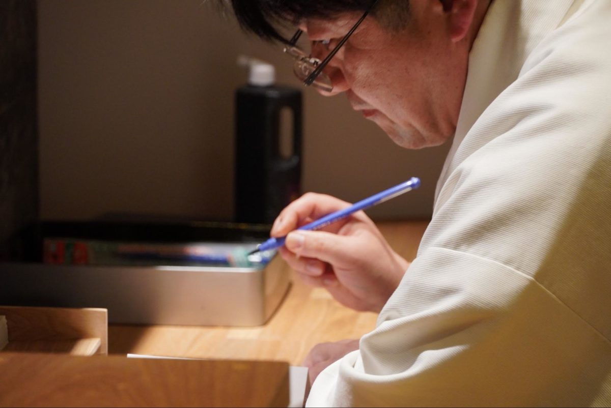 御朱印を書く平林宮司。