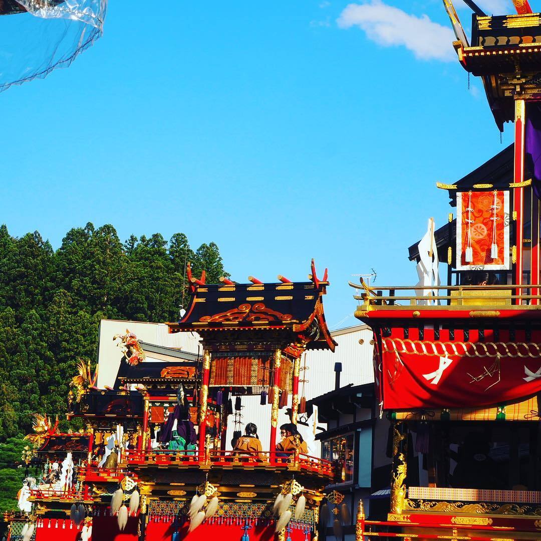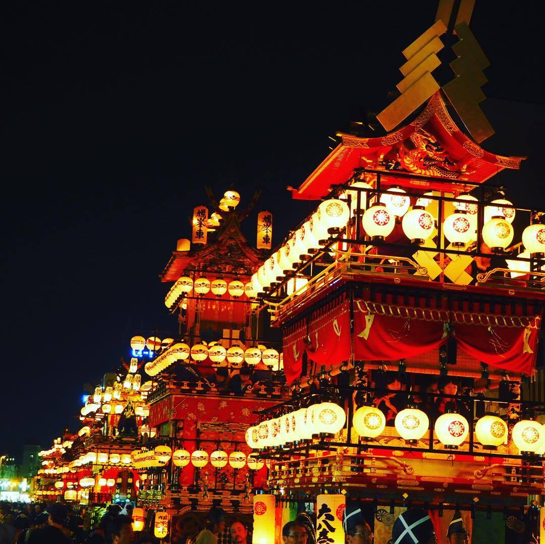 日中に屋台が集結する様子や夜になると各屋台はそれぞれ約100個にもおよぶ提灯を灯し、艶やかに夜の闇を飾る景色は絶景で、京都の祇園祭・埼玉の秩父夜祭と並んで「日本三大曳山まつり」に数えられます。