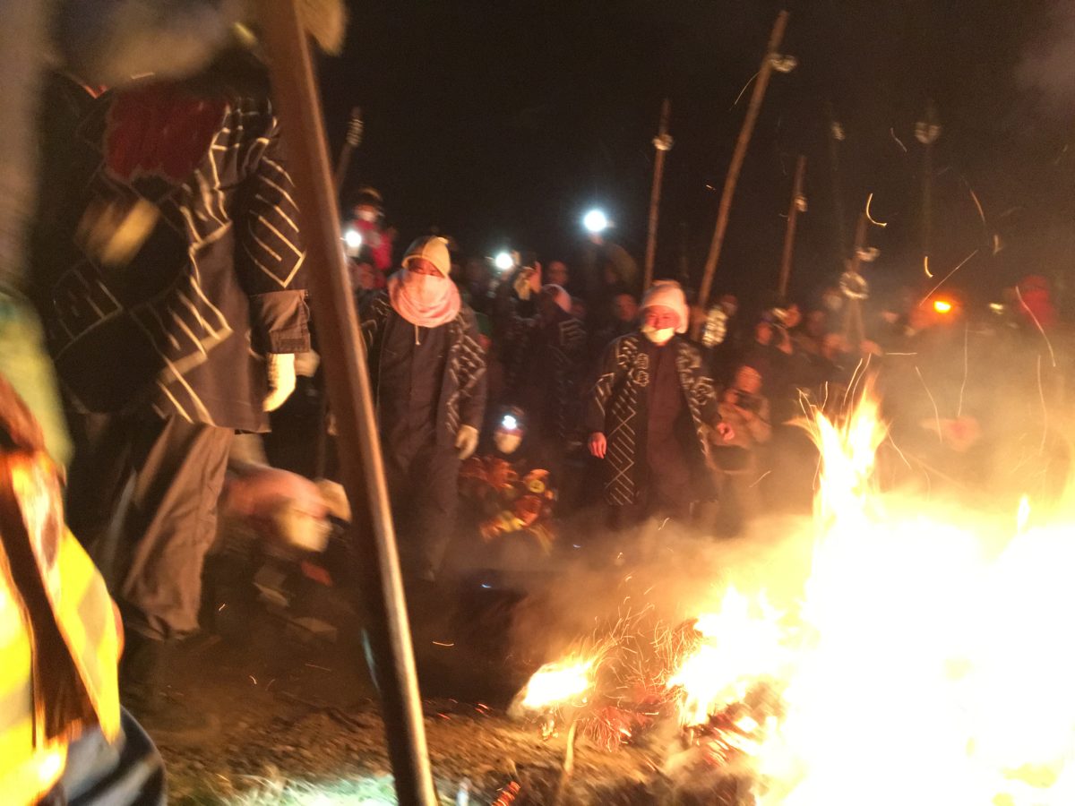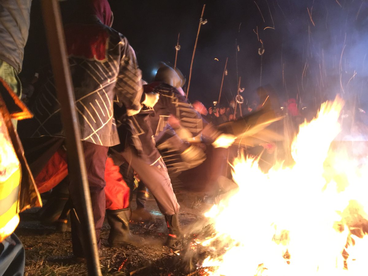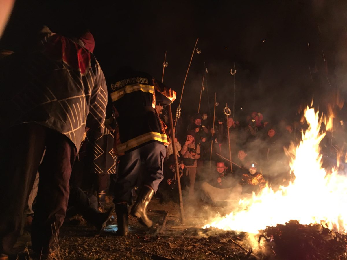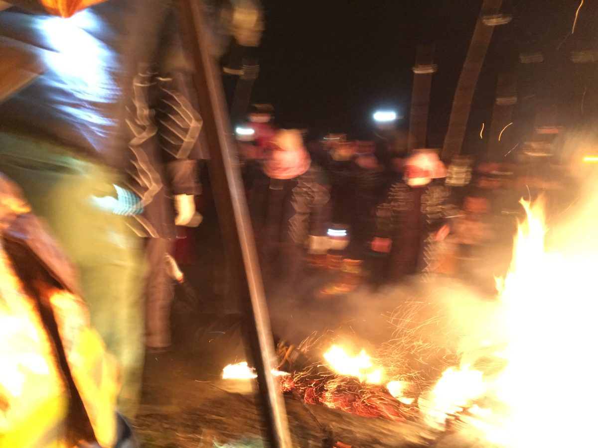 これが次から次へと繰り返されます。厄払いとはいえなんという荒業!ちなみに消防団は炎の近くに必ずいて、引きずり出した男衆の足に燃え盛る松などが絡みついてきた場合には