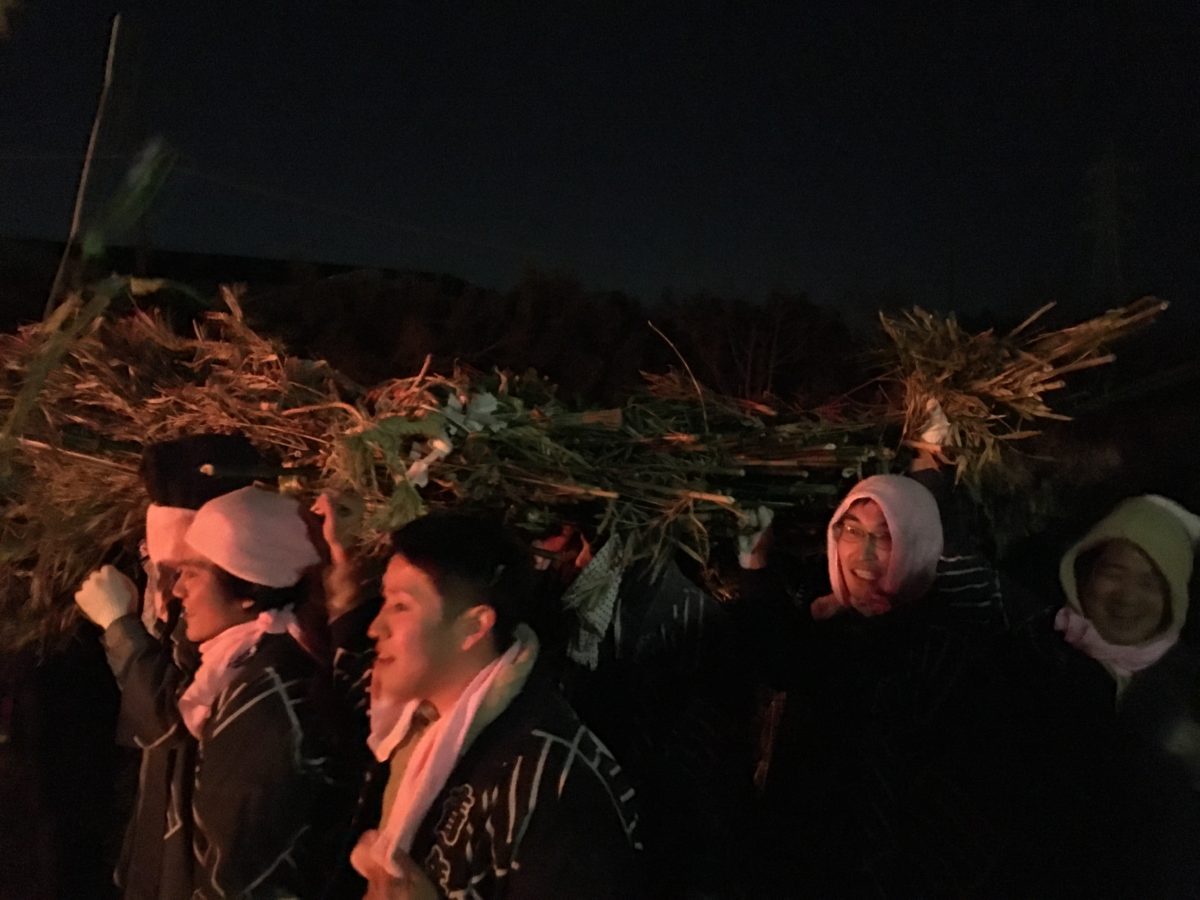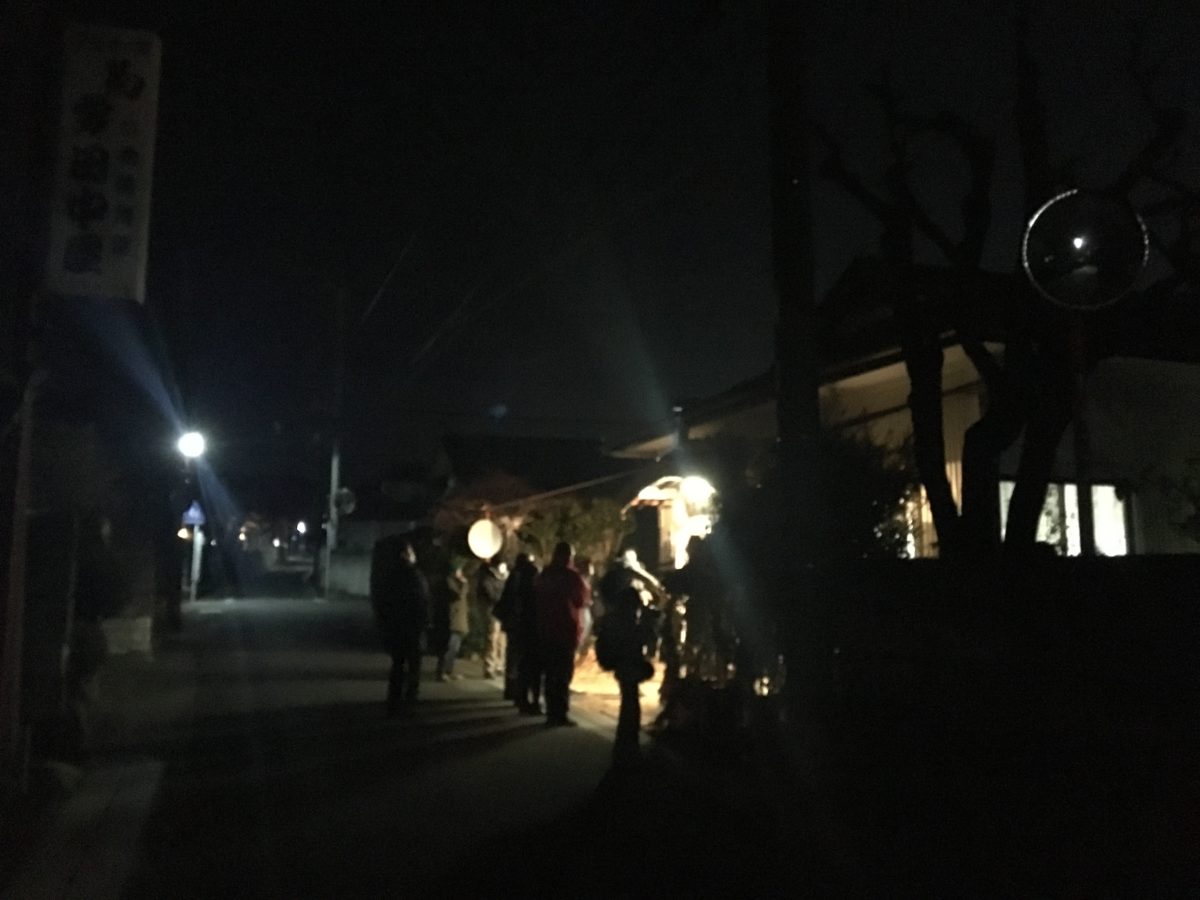 時は19時50分。お酒が回って気合が入ってきたのか公民館の宴が賑々しくなってきました。肩を組んで歌を歌う姿に見学者もいそいそと移動の準備に入ります。ぞろぞろ公民館から出てきた青年会のハッピ軍団が御仮屋にビシッと一礼をするやいなや、御仮屋をわっせと担ぎ練り歩きがついにスタート!