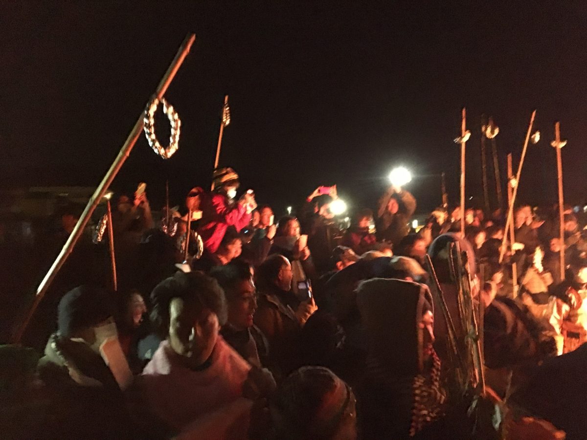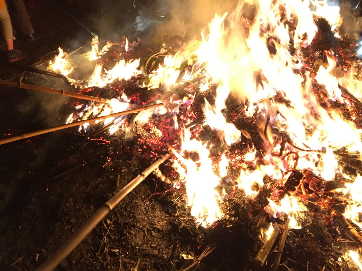 真っ暗な夜空の下、メラメラ燃える焚火に集う地元の人々。バチッとはじける火花に「あっちい!」と逃げ回る男の子や「もう食べていい?」を何度もくりかえす女の子にほのぼの。子供が参加できるお祭りは、地域のつながりが色濃く感じられてやっぱりいいものですね。
