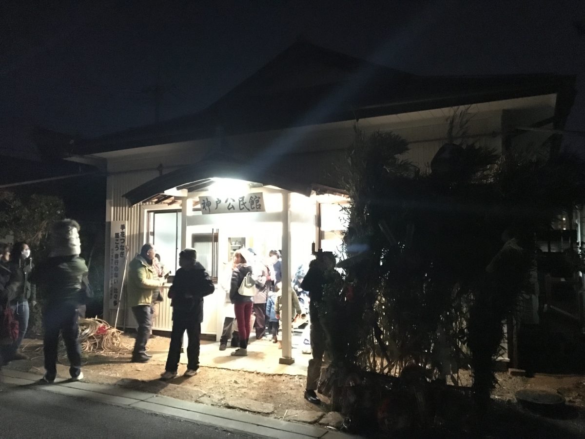 峠の宿、という風情で現れたのは神戸公民館。中では、ハッピを着た男衆が低めの宅を囲んで日本酒などを酌み交わしています。出発時間の19時はとっくに過ぎていますが、聞けば神戸の上(かみ)地区でやっているどんどが長引いているそう。わらわら集まってくるご近所の方や報道のみなさんたちに紛れて、しばし待機。