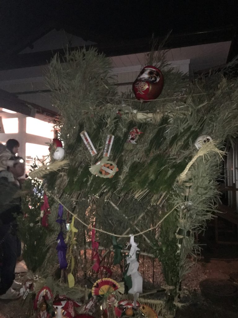 入口には、門松やしめ縄などのお飾りで組み上げられた大きな御仮屋(おかりや)がすでに完成していました。見上げるほどでかい。これが後ほど焚き上げられます。