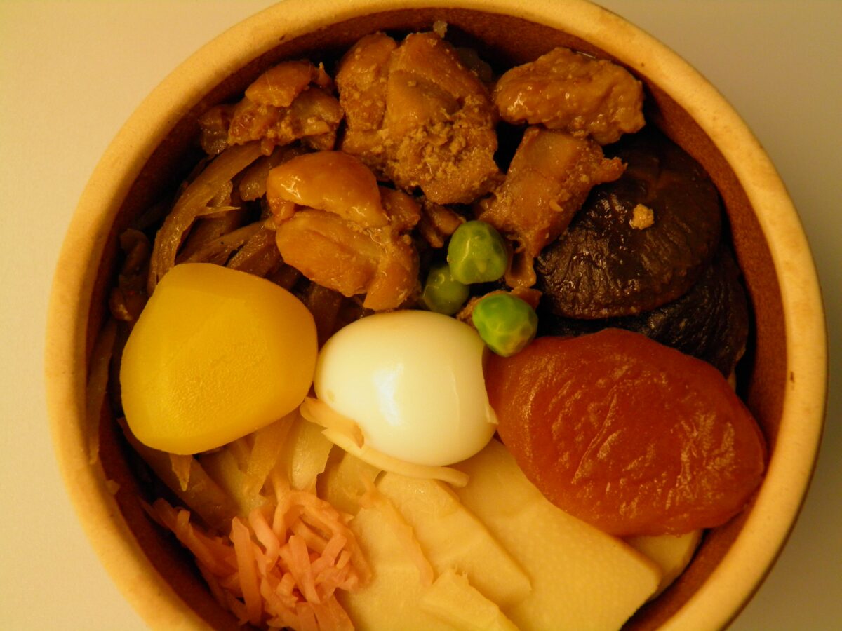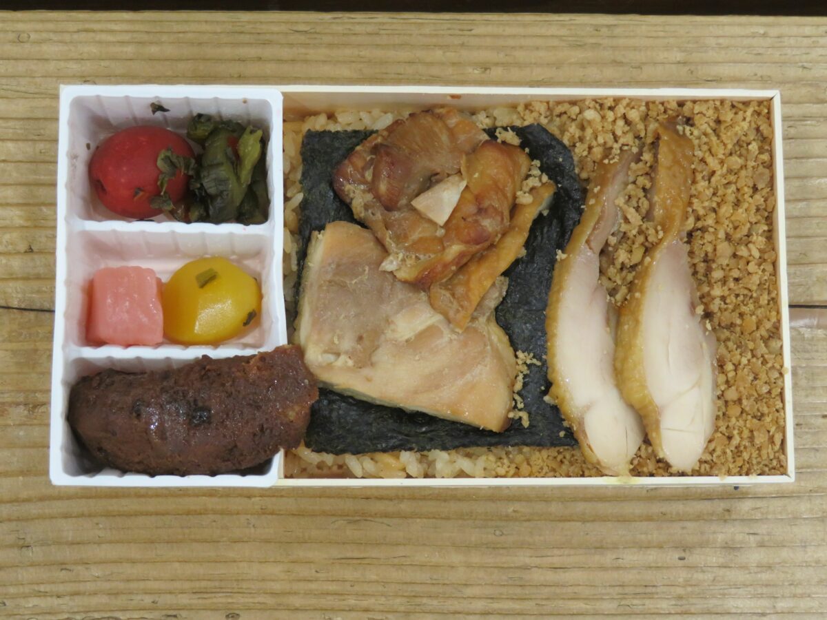 「鶏めし弁当」は1934年に販売が開始されました。茶飯の上を鶏のそぼろと照り焼き、コールドチキンが覆っています。つくねのような舞茸入りの鶏肉団子と、こんにゃく玉、栗、漬物などが添えられています。
