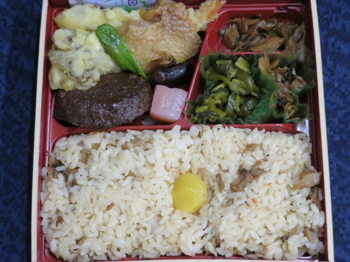 「上州舞茸弁当」のメインは、醤油味の舞茸の炊き込みご飯です。おかずは、舞茸入り肉団子、舞茸佃煮風味の他に、栗甘露煮、鶏照り焼き、舞茸金平風味、エビの天ぷらなどと充実しています。