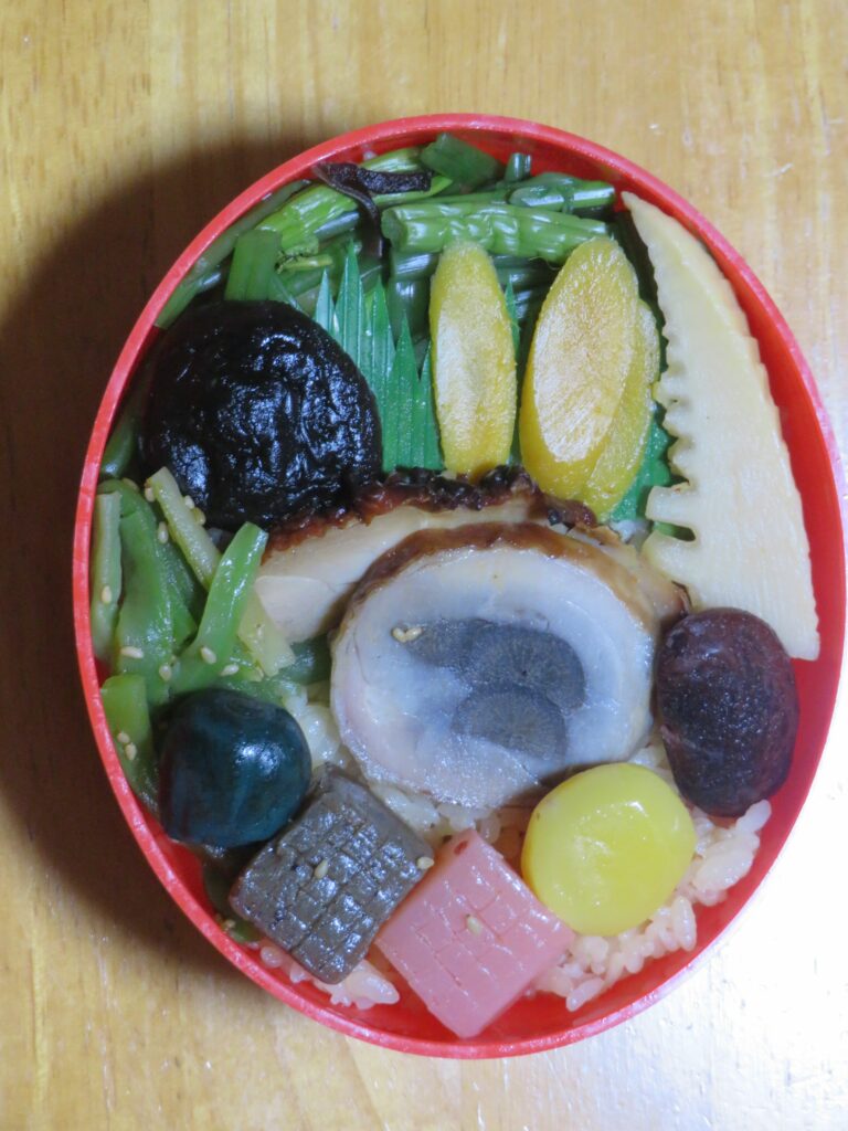 高崎市は交通の要衝となっているばかりでなく、全国一のだるまの生産量を誇っています。「だるま弁当」の容器はだるま形です。茶飯風の炊き込みご飯の上に、筍・こんにゃく・栗・牛蒡・鶏肉などの具材が載せられています。容器のだるまの口の部分には穴が空けられているため、食べ終わった後には貯金箱として利用することができます。