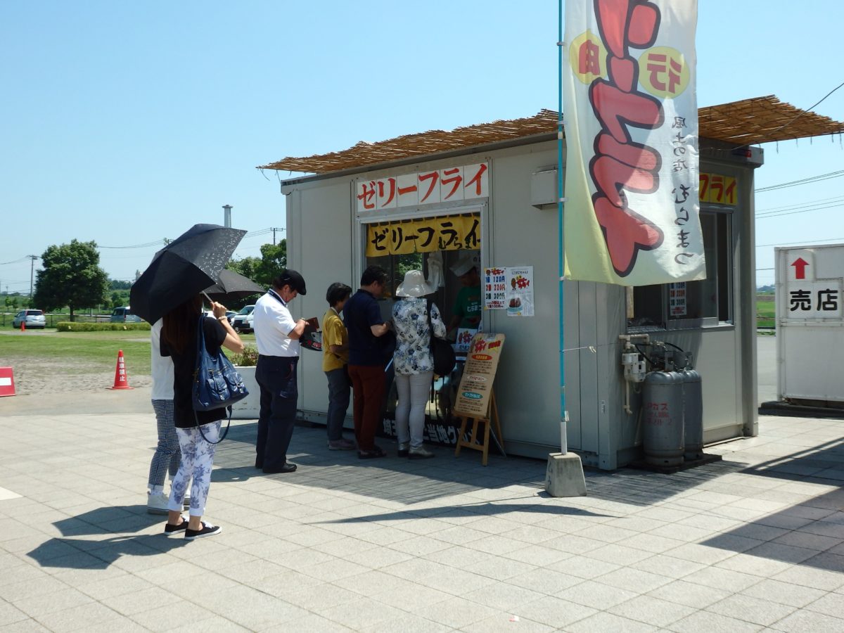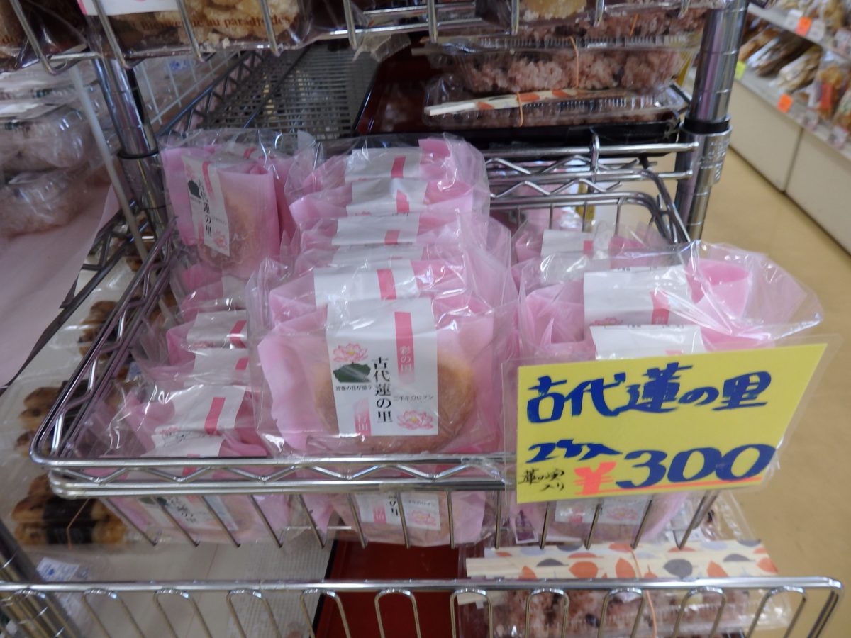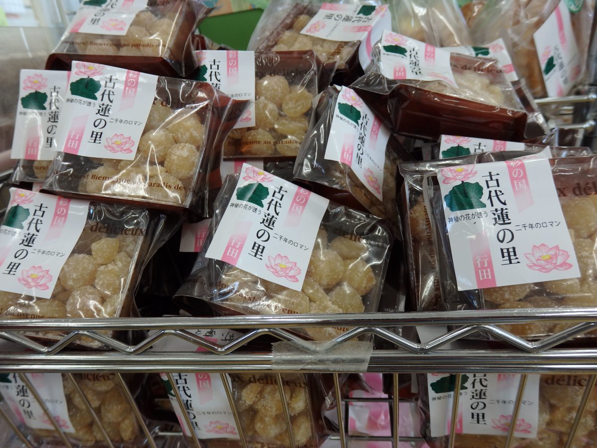 「世界の蓮園」に接するエリアには、屋根つきのベンチがゆったりした間隔で並べられています。休憩所に沿って建つ売店には、蓮の加工食品が品揃え豊富に並んでいます。行田市のB級グルメ、ゼリーフライのコーナーもあります。ゼリーフライは、おからと茹でたジャガイモを混ぜコロッケのように素揚げしています。