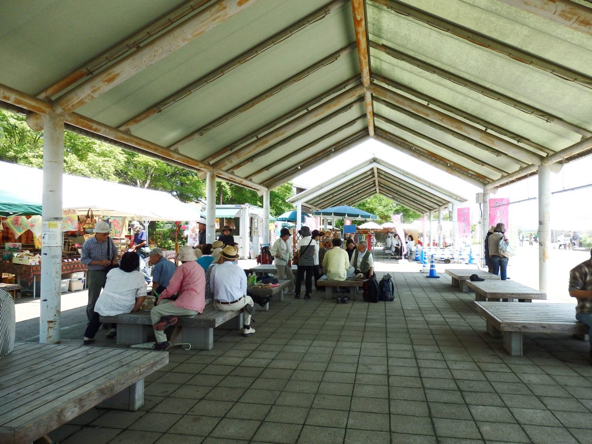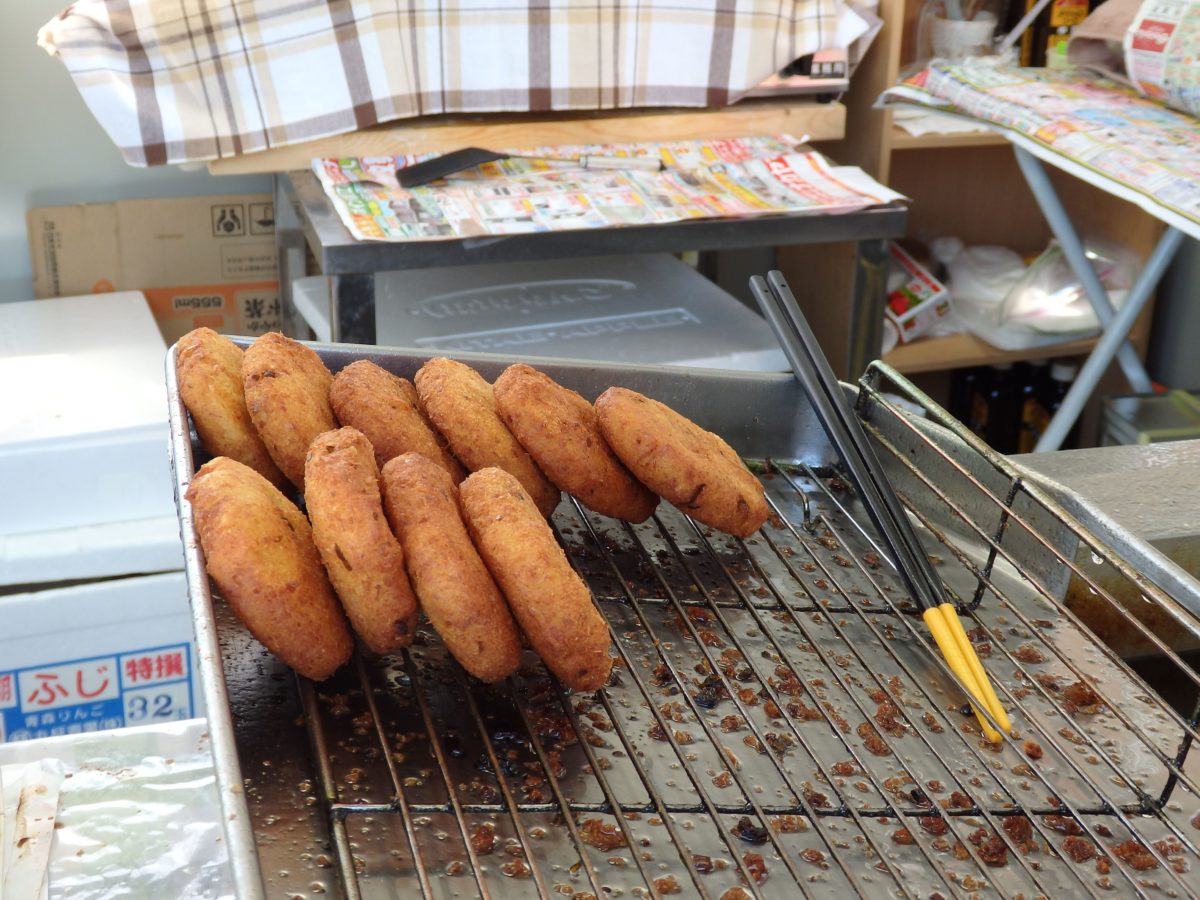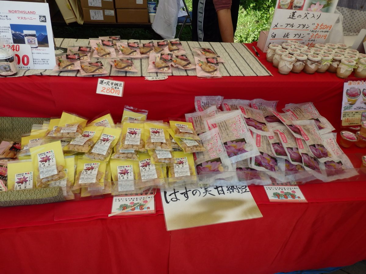 「世界の蓮園」に接するエリアには、屋根つきのベンチがゆったりした間隔で並べられています。休憩所に沿って建つ売店には、蓮の加工食品が品揃え豊富に並んでいます。行田市のB級グルメ、ゼリーフライのコーナーもあります。ゼリーフライは、おからと茹でたジャガイモを混ぜコロッケのように素揚げしています。