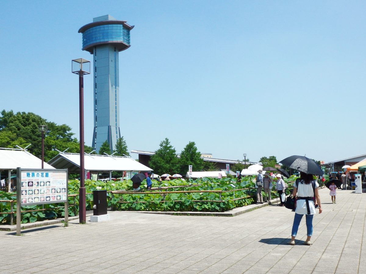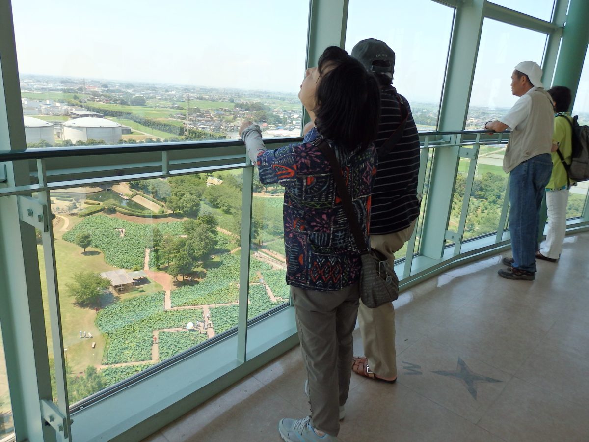 「古代蓮の里」の南東の端に建つ地上約50メートルのタワーは古代蓮会館です。1階の展示室では、永い眠りから目覚めた古代蓮が発芽し、開花する様子を見ることができます。タワーの最上部は展望室となっており、眼下には関東平野の姿が360度のパノラマで広がります。