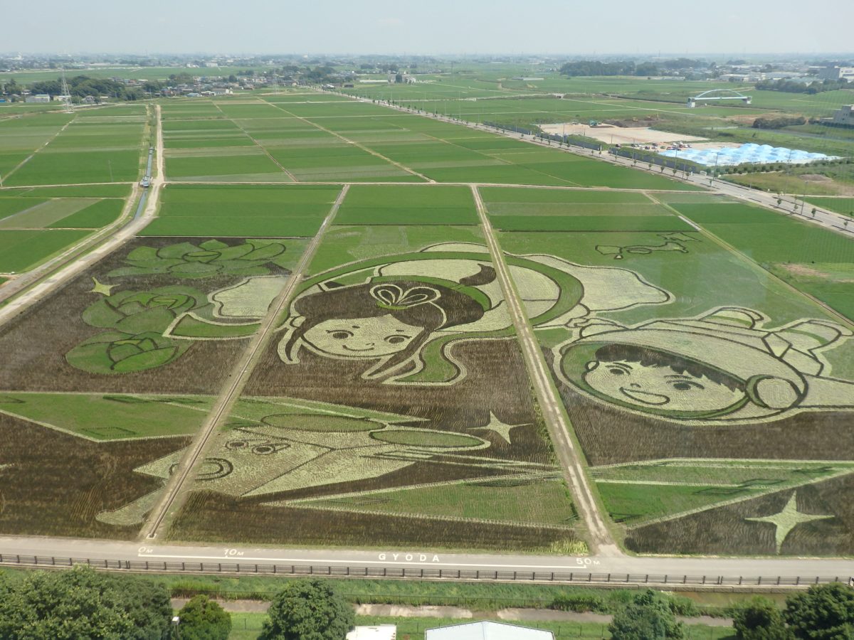 さらに展望室の東側からはユニークな景観を見ることができます。水田をキャンバスに見立て、色彩の異なる稲で絵や文字を形作る田んぼアートです。2015年には「最大の田んぼアート」としてギネス世界記録に認定されました。