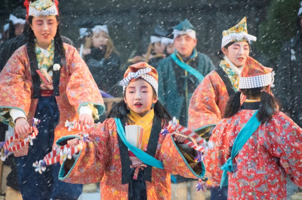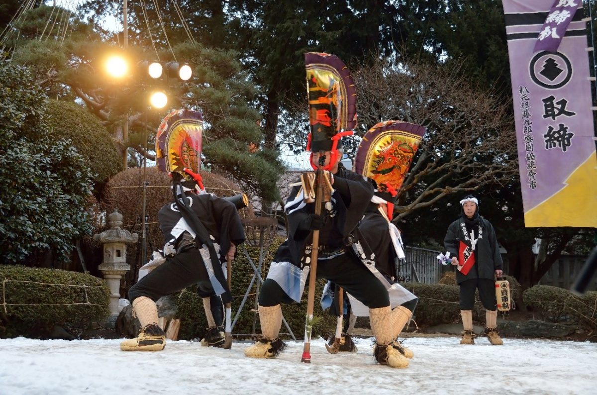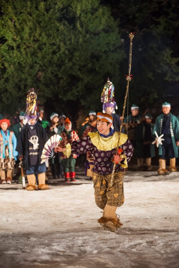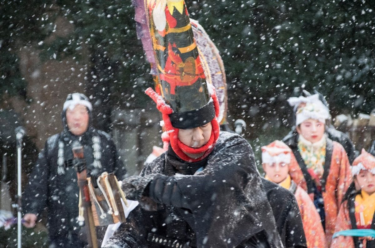 見る人の心をとらえるのは、「太夫(たゆう)」と呼ばれる踊り手。煌びやかな烏帽子をかぶり、凍てつく大地を揺さぶり、春を呼ぶ願いを込めて舞い(摺(す)り)ます。まずはこちらをご覧ください。