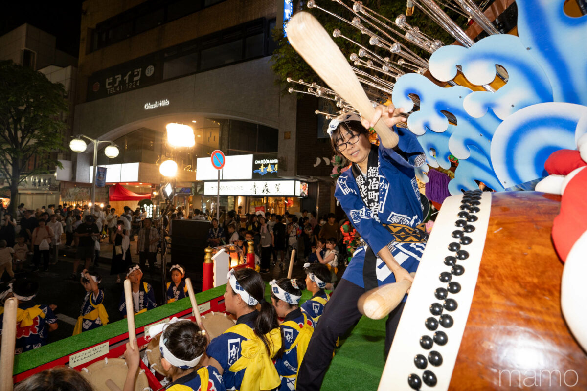 前夜祭では中心街・八戸市庁前に山車が4年ぶりに勢揃い。子どもたちが奏でる小太鼓の軽快なリズム、秋まつりの名残を感じさせる笛の音、そして「よーいよーい よいさーよいさー よいさーのせー」というお馴染みの掛け声。子どもたちはいつものように、元気いっぱいの姿を見せてくれました。