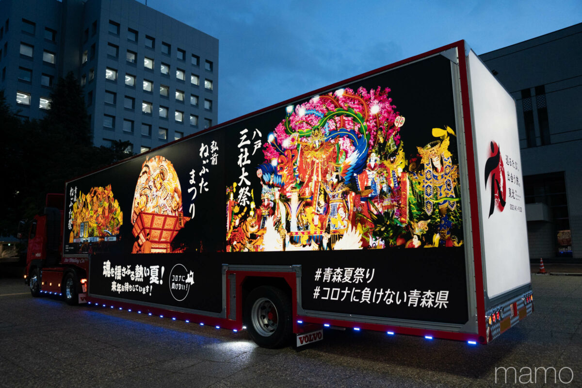 青森県を代表する3つの祭りがプリントされたアドトラック。2020年、八戸を出発し県内を巡った。