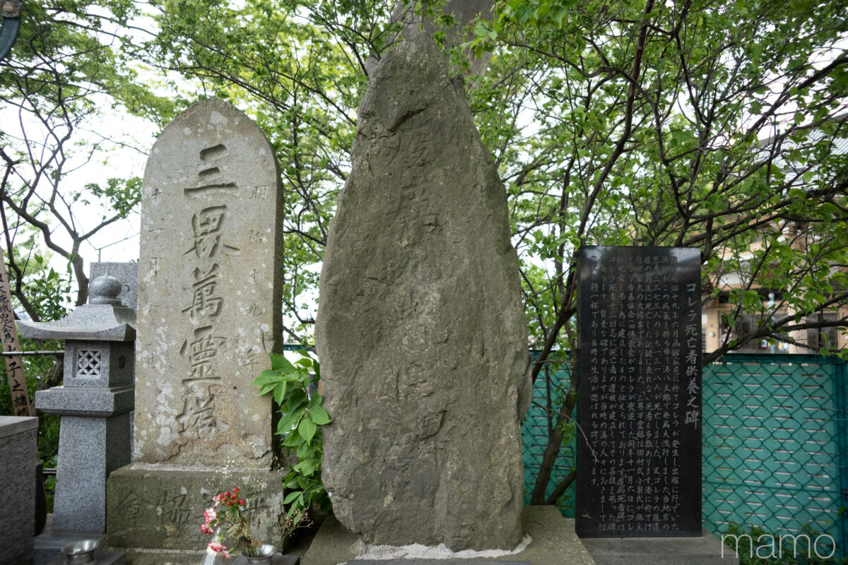 八戸に残る「コレラ供養塔」。明治19年、1300人以上が命を奪われた感染症をきっかけに、八戸三社大祭の山車が作られるようになったとも伝わる。