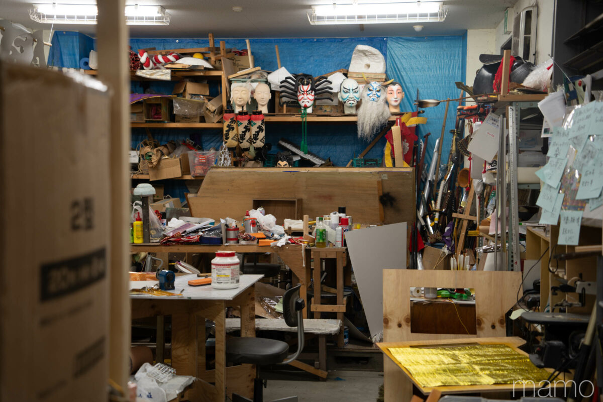消防屯所で衣装を作るスタッフ