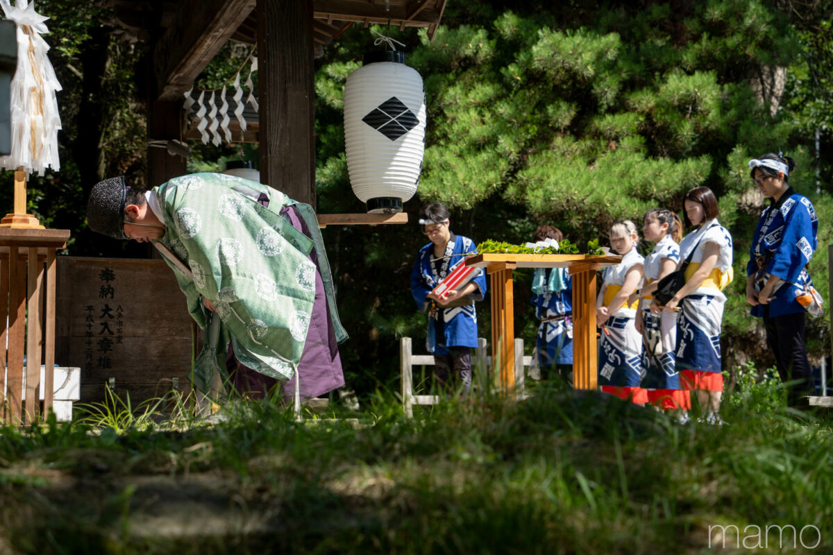 祭り期間中、地域を見守る氏神に挨拶する祭り関係者。