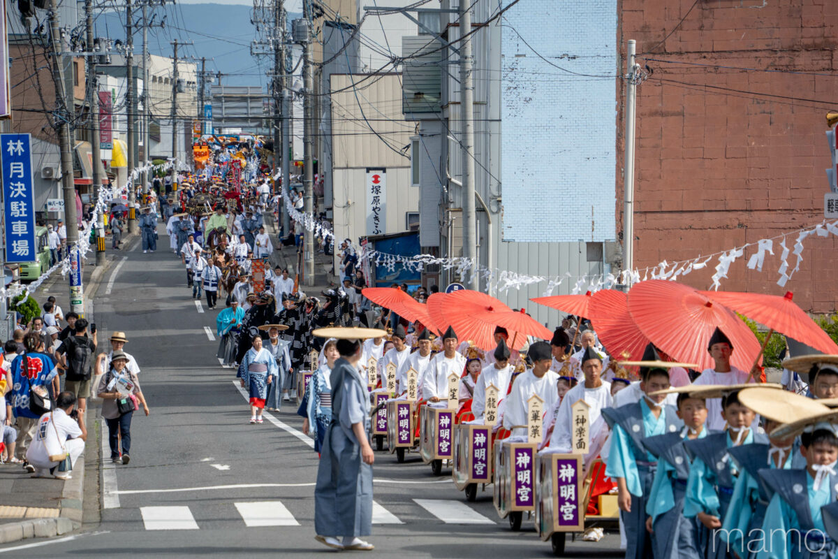 江戸時代の1721年の発祥から約300年。明治期に法霊山おがみ(龗)神社・長者山新羅神社・神明宮の三社の祭りとなってからからはもうすぐ140年。街を彩る神社行列、山車、郷土芸能は、市民の手によって受け継がれ続け、その規模を大きくしてきました。