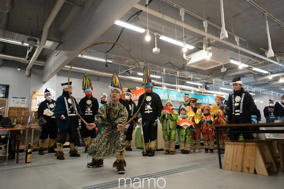 祭り期間中は祭りの公式行事のほかに、個人宅・商店・飲食店などをめぐる「門付け」が至る所で行われます。港町・八戸の情緒が感じられる観光名所「八戸市営魚菜小売市場」には、朝からいくつかのえんぶり組が駆けつけ、鮮魚店を巡って舞を披露。