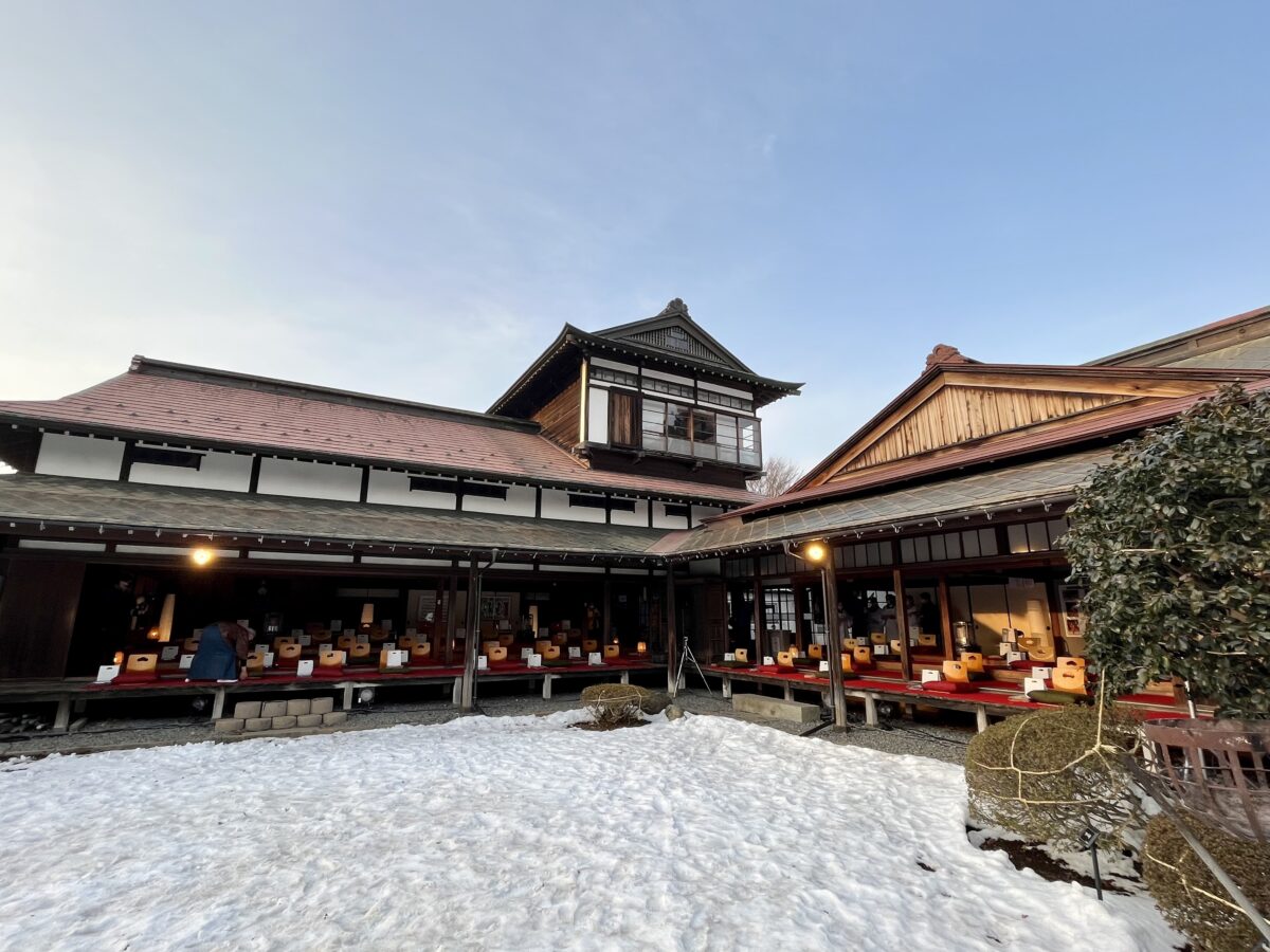 明治時代に建てられた歴史的建造物「更上閣」では、恒例の有料公演「お庭えんぶり」も例年通り開催。雪の積もる日本庭園で繰り広げられるえんぶりを、屋内から眺める贅沢な企画。