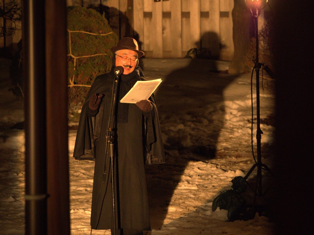 明治時代の衣装に身を包んだスタッフが「ようこそ」を意味する南部弁「おんでやんせ」の挨拶で客をお出迎え。司会の柾谷伸夫さんは、青森・岩手の方言「南部弁」や八戸の昔話「南部昔コ」の伝承活動を手掛けています。お庭えんぶりの顔とも言える柾谷さんは18日の空間演出企画で八戸の街に電気が通った明治40年代の情景などを、当時にタイムスリップしたような語り口で紹介。情感たっぷりな空間が広がりました。