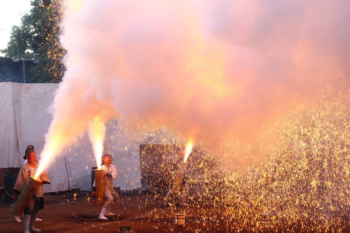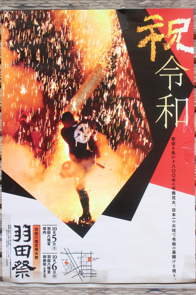 このポスターにあるような、手で花火筒を持って行うパフォーマンスを「手筒花火」と言います。羽田祭は吉田神社の豊橋祇園祭、安久美神戸神明社の豊橋鬼祭と並ぶ豊橋三大祭に数えられていて、豊橋祇園祭でも手筒花火の奉納が行われています。