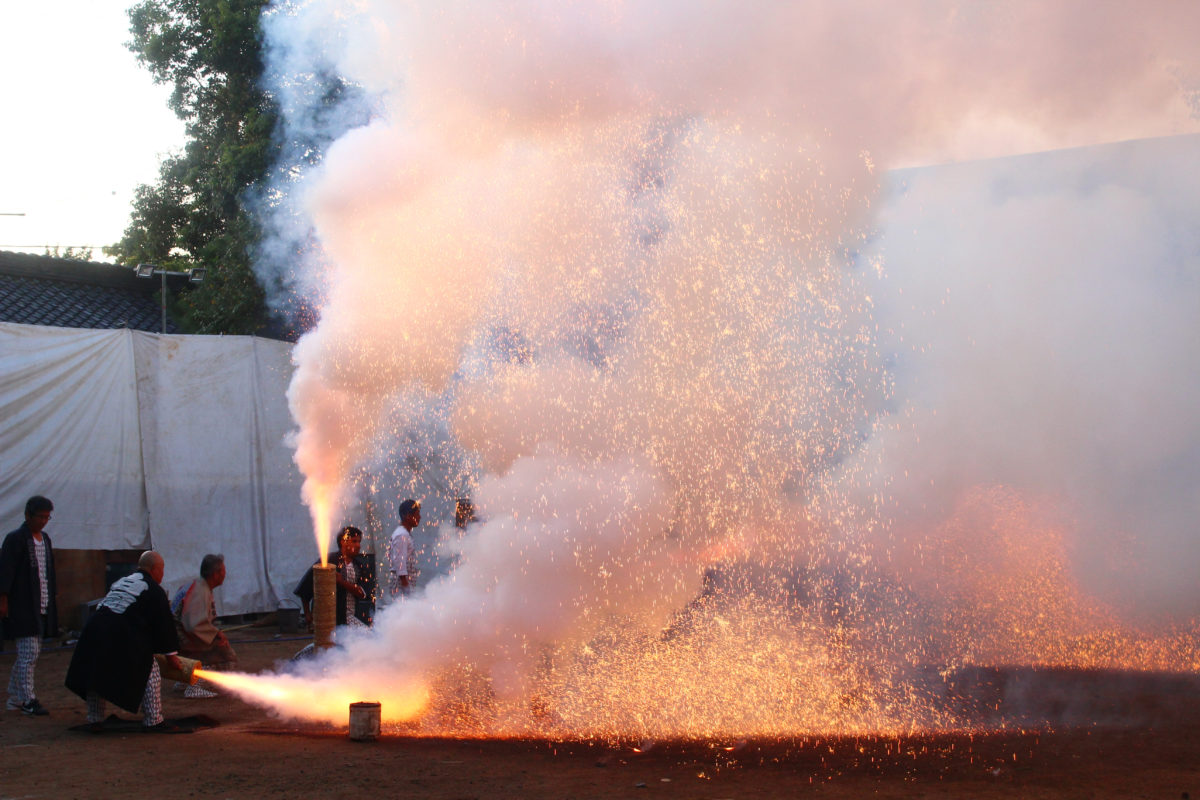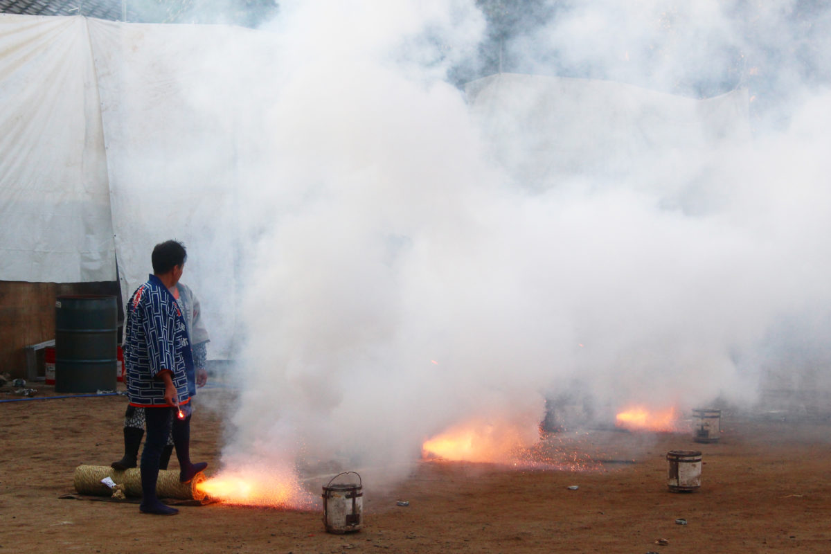 辺りも薄暗くなってきた頃合いで、手筒花火が用意されました!まずは花火を地面に置いたままで点火されます。