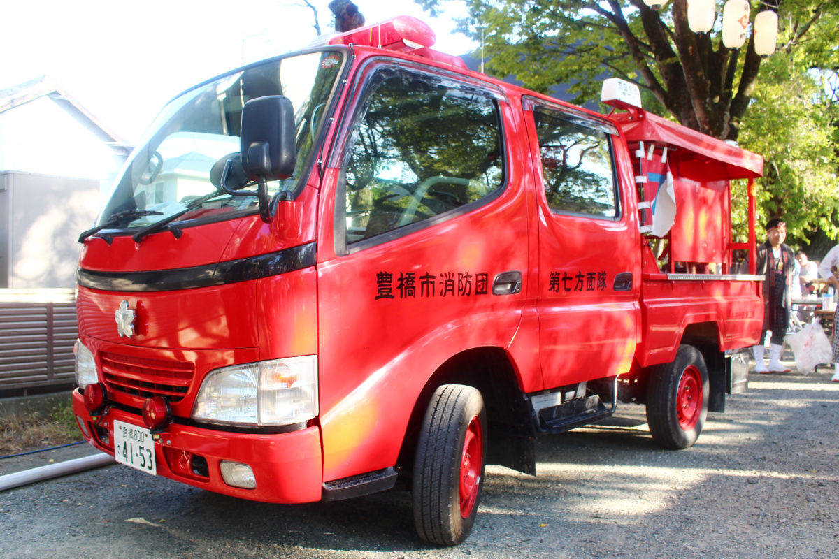 狭い神社境内で大掛かりな花火を行うので、参道には消防車がスタンバイしています。