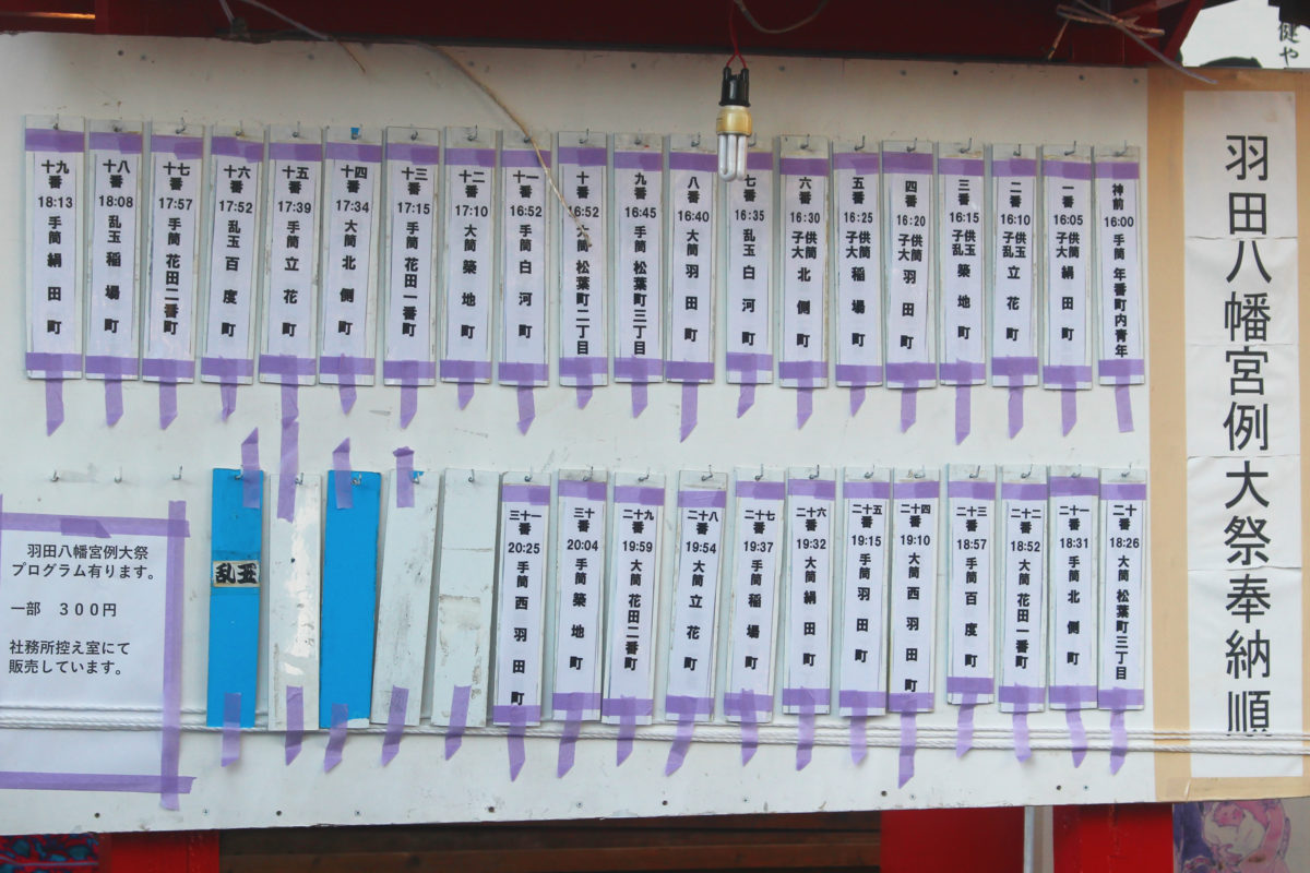 境内の入口へ着きました!本日の花火の奉納順が掲げられています。18時の神前手筒花火(非公開)からはじまり、子どもたちの花火奉納を終えた後、ダイナミックな大人の花火奉納へと移っていきます。