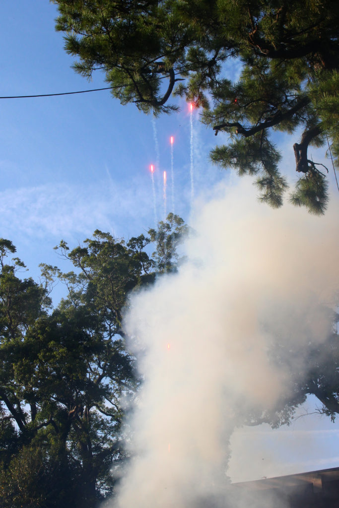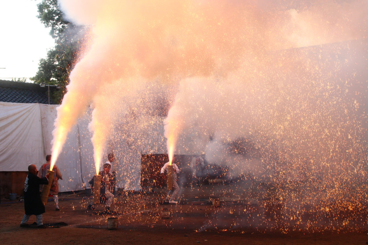 手筒花火が持ち上がりました!シューと言う花火の音と共に、火の粉が境内を舞います。