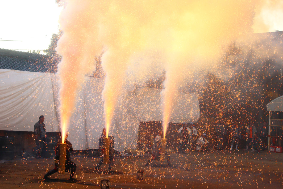 豊橋駅から徒歩10分弱の場所にある、羽田八幡宮を目指して進みます。境内へ近づいてきたところ、早速花火のやぐらが立ち並んでいました!こちらは手筒ではなく、空高く花火を打ち上げる大筒や色とりどりの花火を魅せてくれる乱玉の花火です。