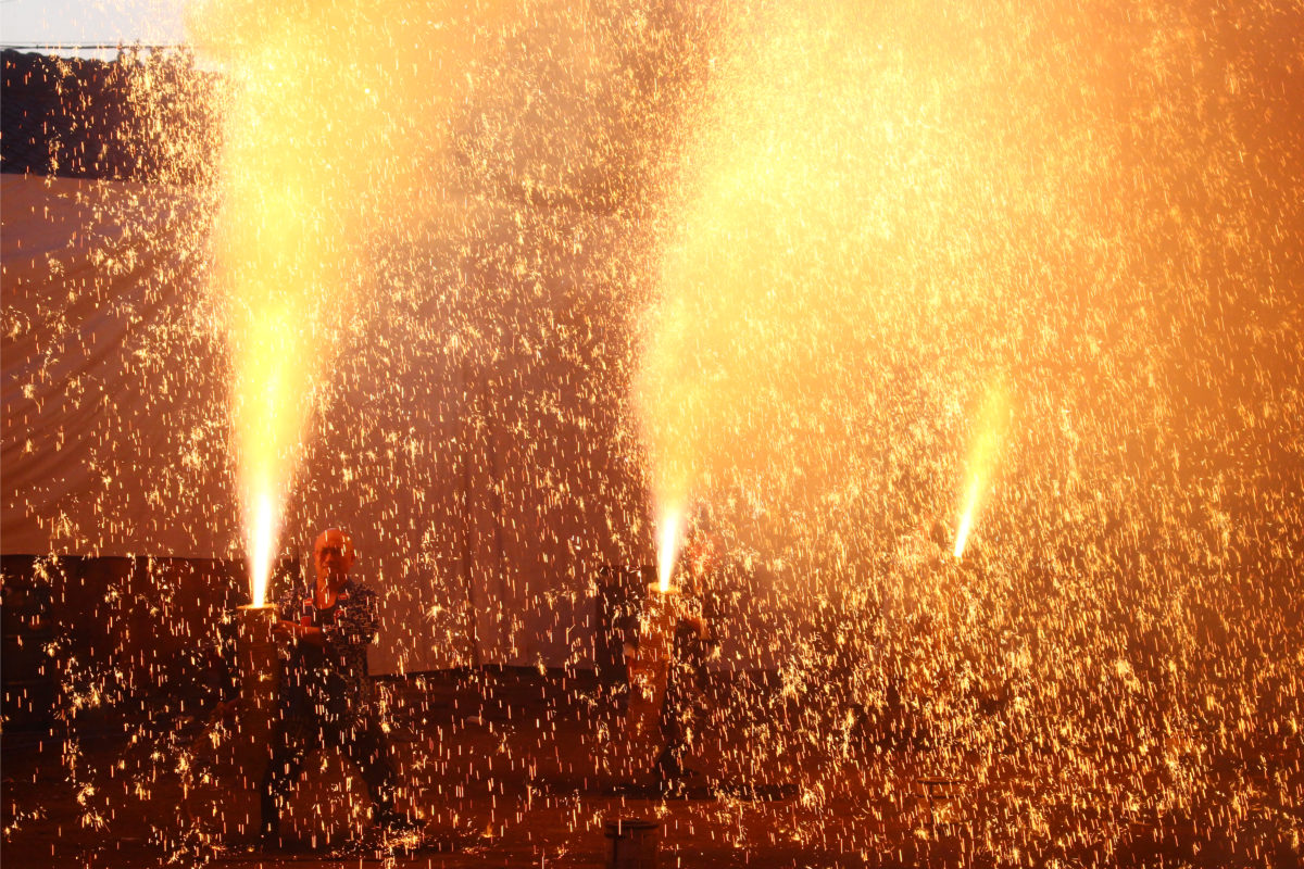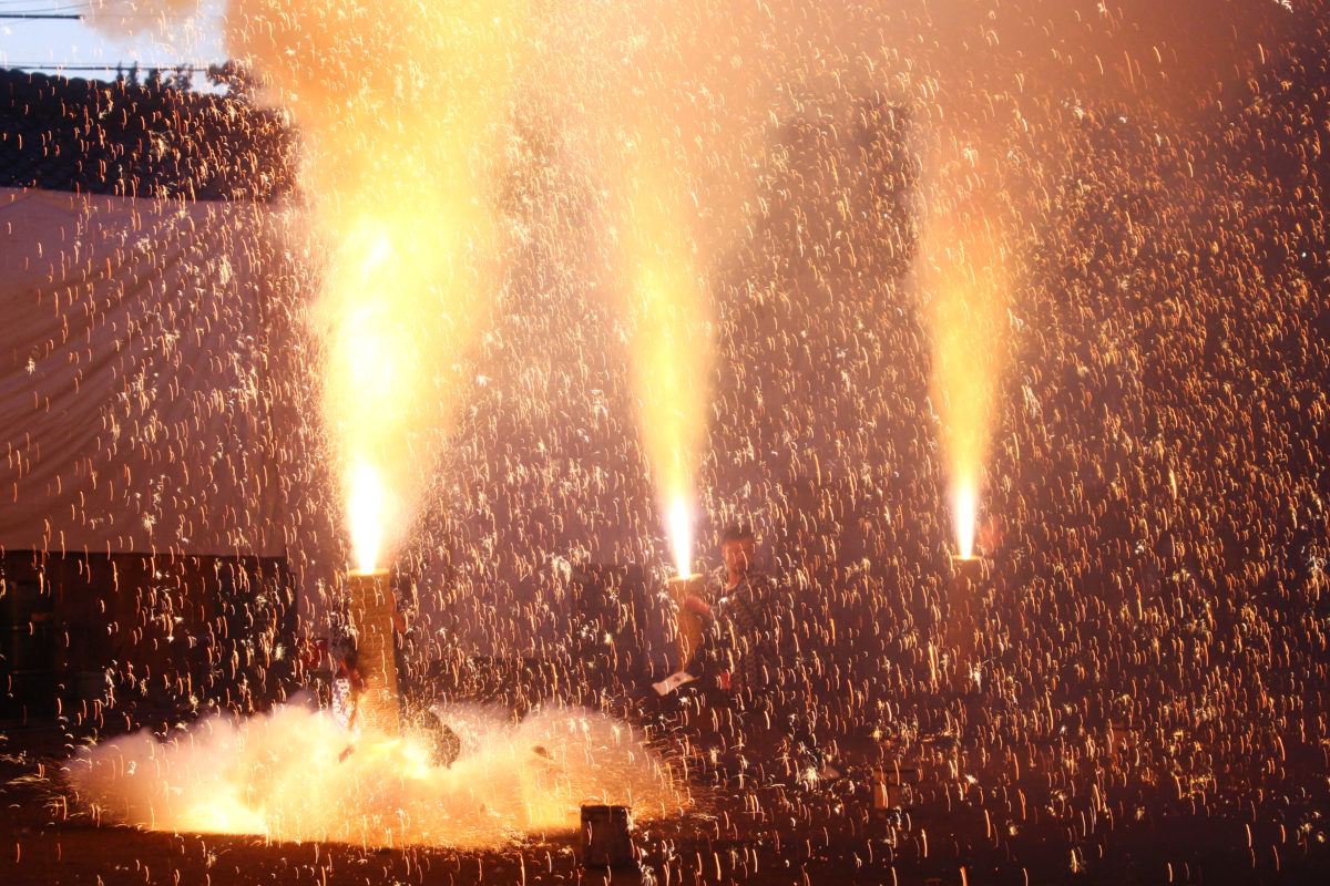 あたりが暗くなると、一層手筒花火の輝きが増します!火花が舞う様子が美しいですね!