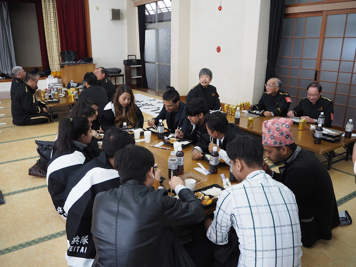 まず萩時代パレード参加者は11:00に萩市役所隣の福祉センターへ集合してお昼ごはんをいただきます!みんなで仲良くお弁当を食べます。