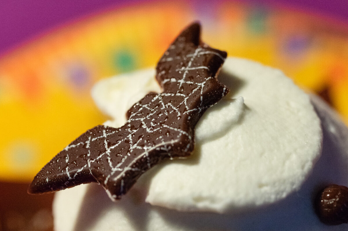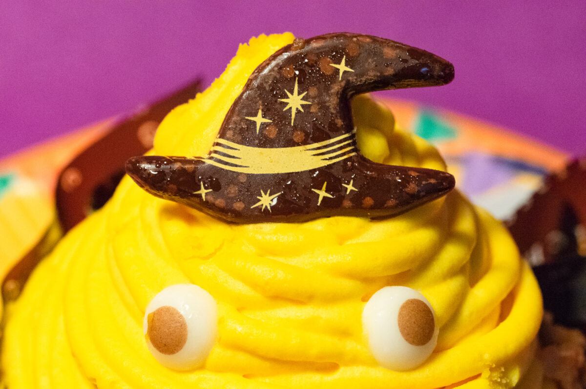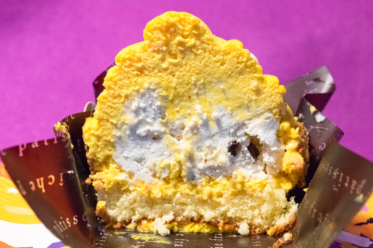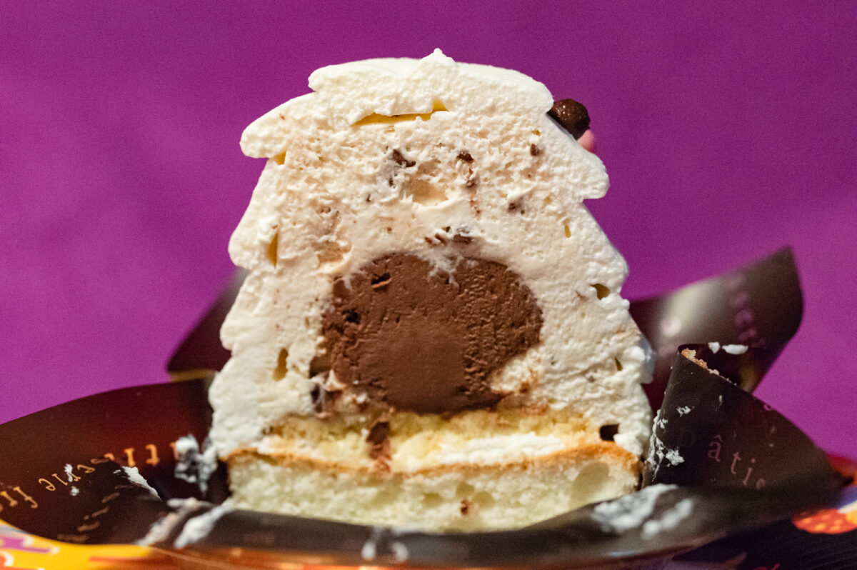 土台はしっとりとしたスポンジ生地。表面は、かぼちゃフレイバーのクリームで、ふわふわとした口当たり。中央は、もったりとした優しい甘さのクリーム。クリームの中から顔を覗かせるシリアル入りチョコレートや、周りに飾られたクランチが食感のメリハリとなっています。1品目の「いたずらゴースト」と比べると、ややお兄さん・お姉さん向けのケーキです。