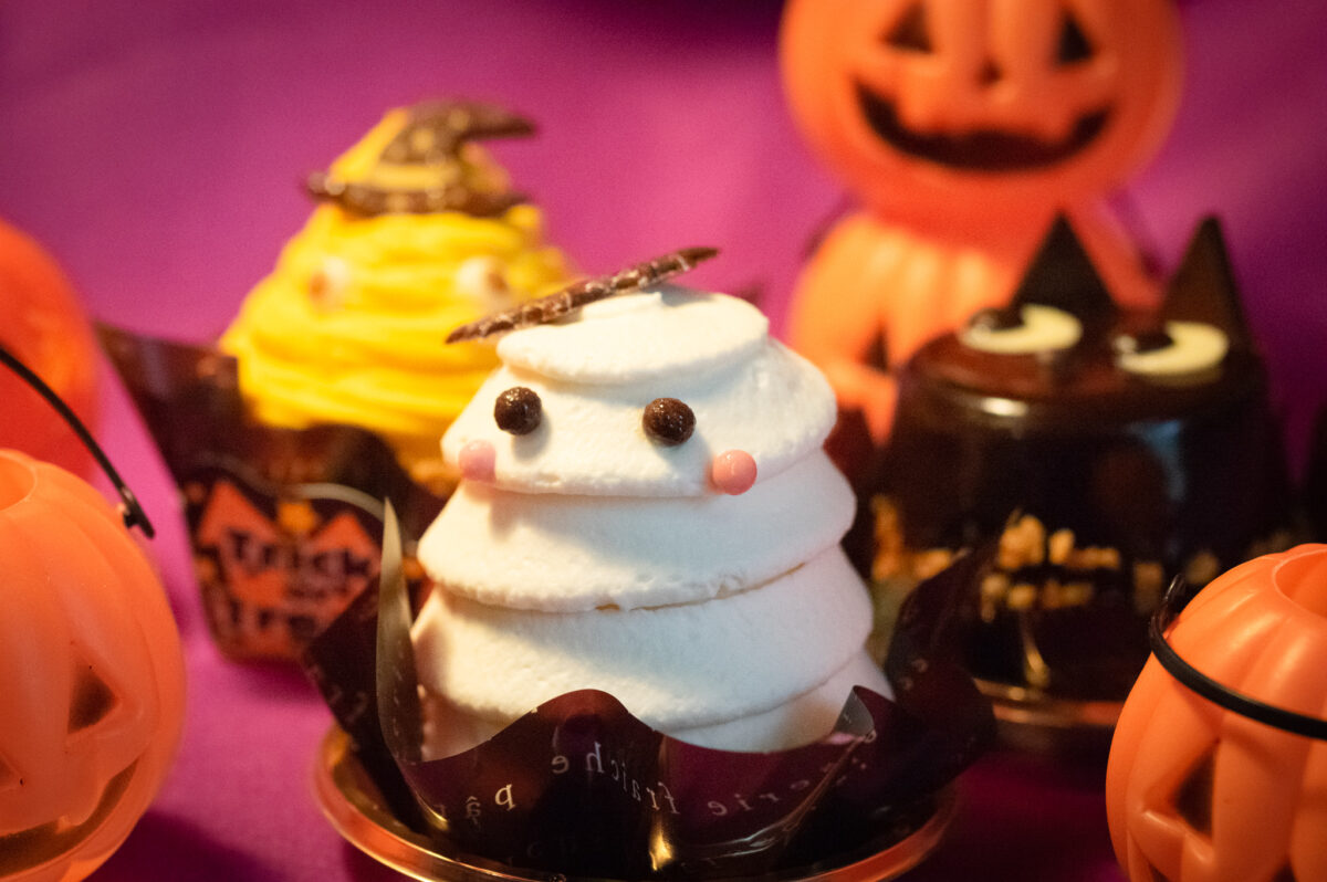 実食1品目は、パーティーにいたずらしに行くおばけをイメージしたというプチケーキ。
