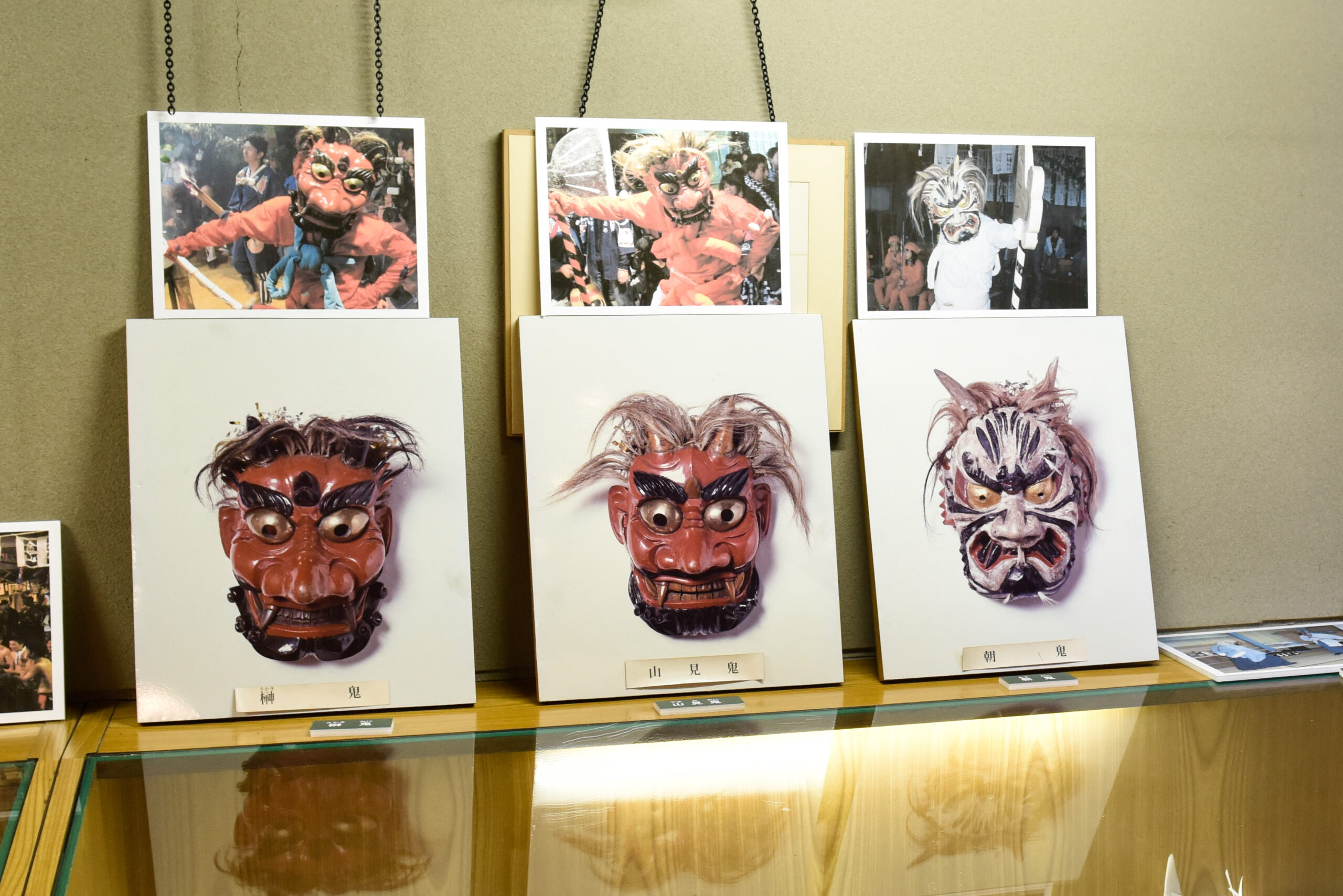 花祭展を見た後、2階に上がるとこちらでは常設展が行われており、各地区の花祭の写真や祭り道具がとにかくたくさん展示されていた。花祭に登場する鬼は、榊鬼と山見鬼と朝鬼がいて、それぞれの地域でお面の表情や作り方が全く違うということを知ることができた。花祭とは?を知る上で、各地区の花祭の様子が伝わってくる素晴らしい展示と感じた。