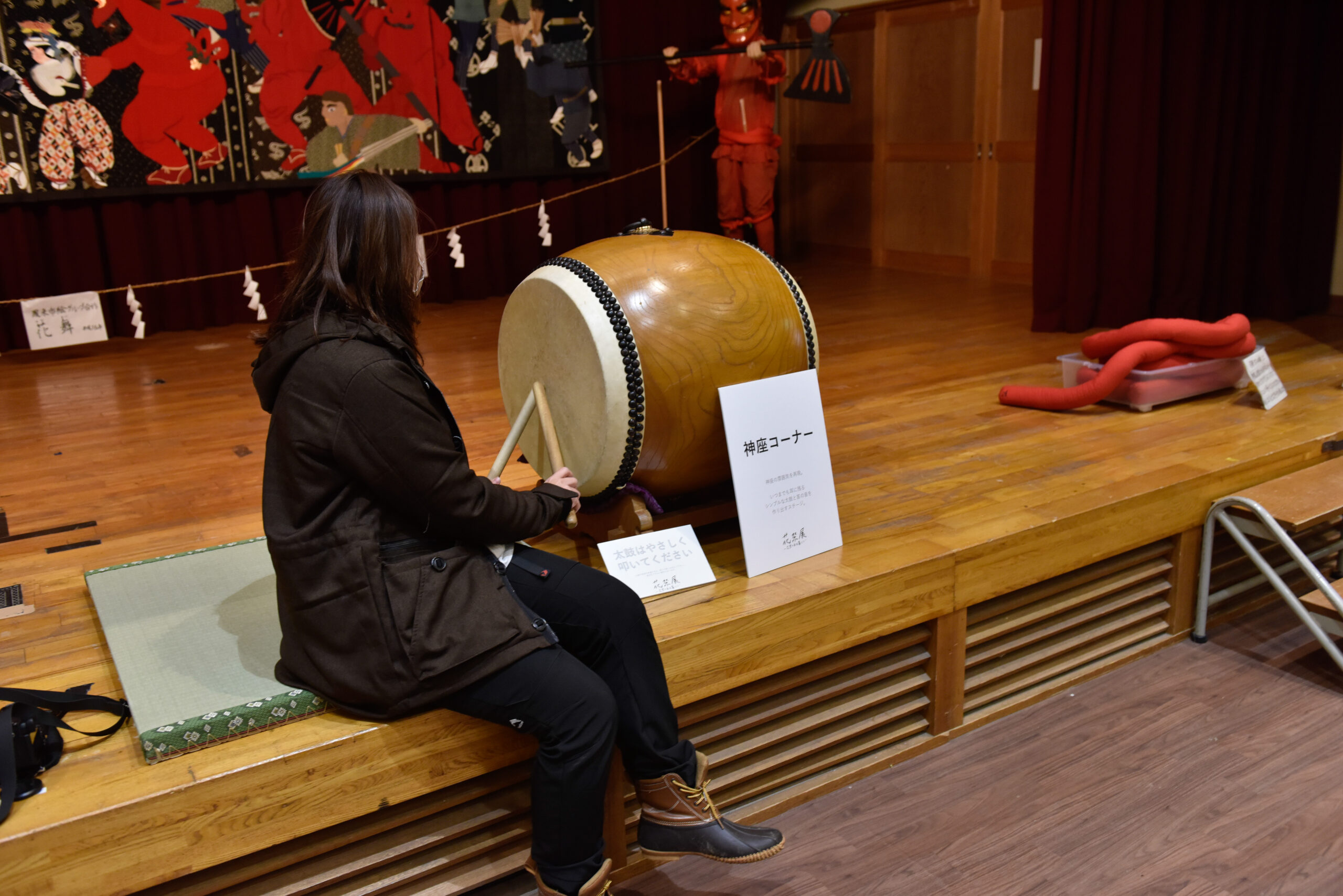 花祭展ではまず、祭り道具がずらりと並ぶステージがあり、太鼓を実際に叩いてみる体験ができるようになっている。また、申し出れば、鬼のお面の下にかぶるクッションをつけさせてもらうこともできる。このように体験型の展示が魅力的だと感じた。