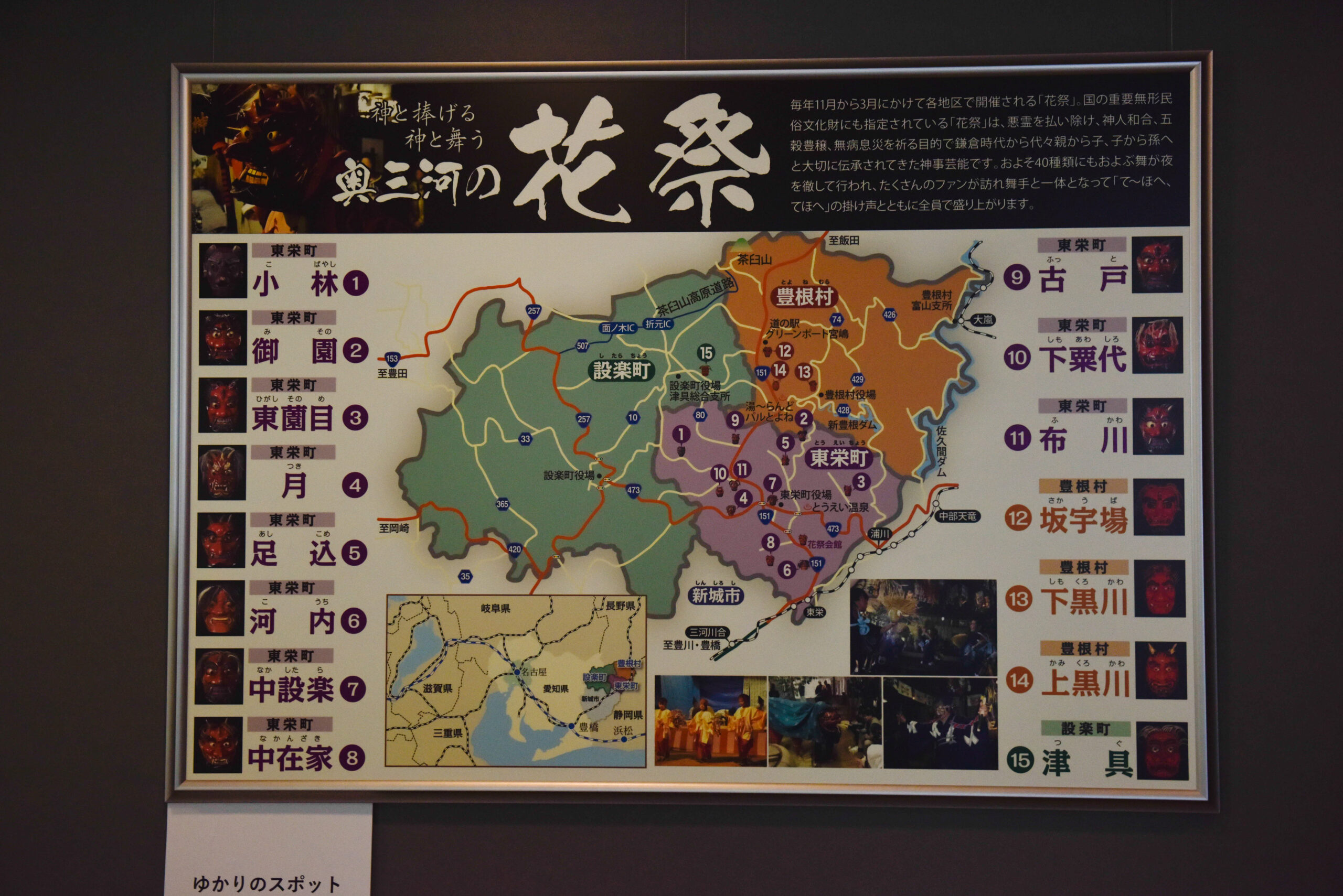 そういえば、花祭会館の展示を拝見する中で、壁にある地図が掲示されていることに気づいた。花祭はどの地区で継承されているのかがわかる地図のようだ。各地区の花祭の担い手は、自分の地域と他の地域の花祭の内容の違いがわかっている人も多いと聞く。これは全地区を見える化していくような今回の展示や花祭会館の活動、そして、花祭のMAPを制作するような地道な取り組みがあってこそだろう。