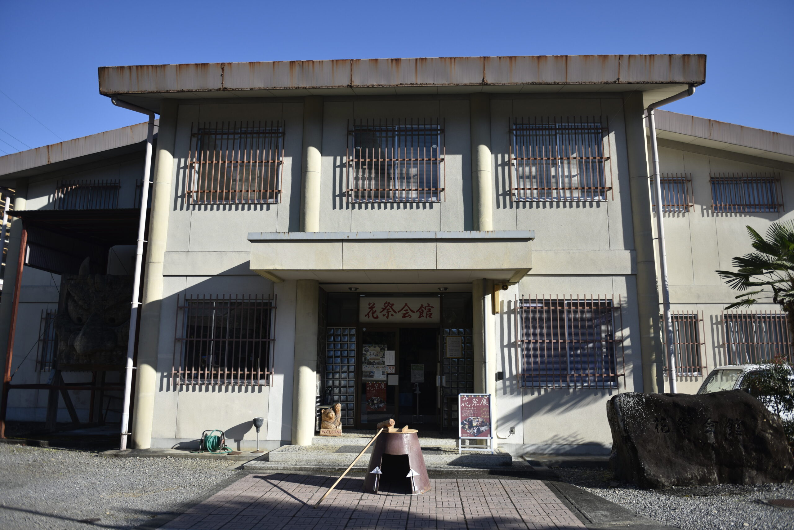 花祭会館は愛知県の山深い場所にあり、公共の交通機関でアクセスするにはJR飯田線の東栄駅から公共バスに乗る必要がある。電車・バス共に1-2時間に1本程度の運行なので、車でのアクセスが便利かもしれない。花祭会館の玄関前には、祭りの際に会場の中央に置かれる釜が置かれており、お湯を沸かす「湯立て」を再現しているようだ。