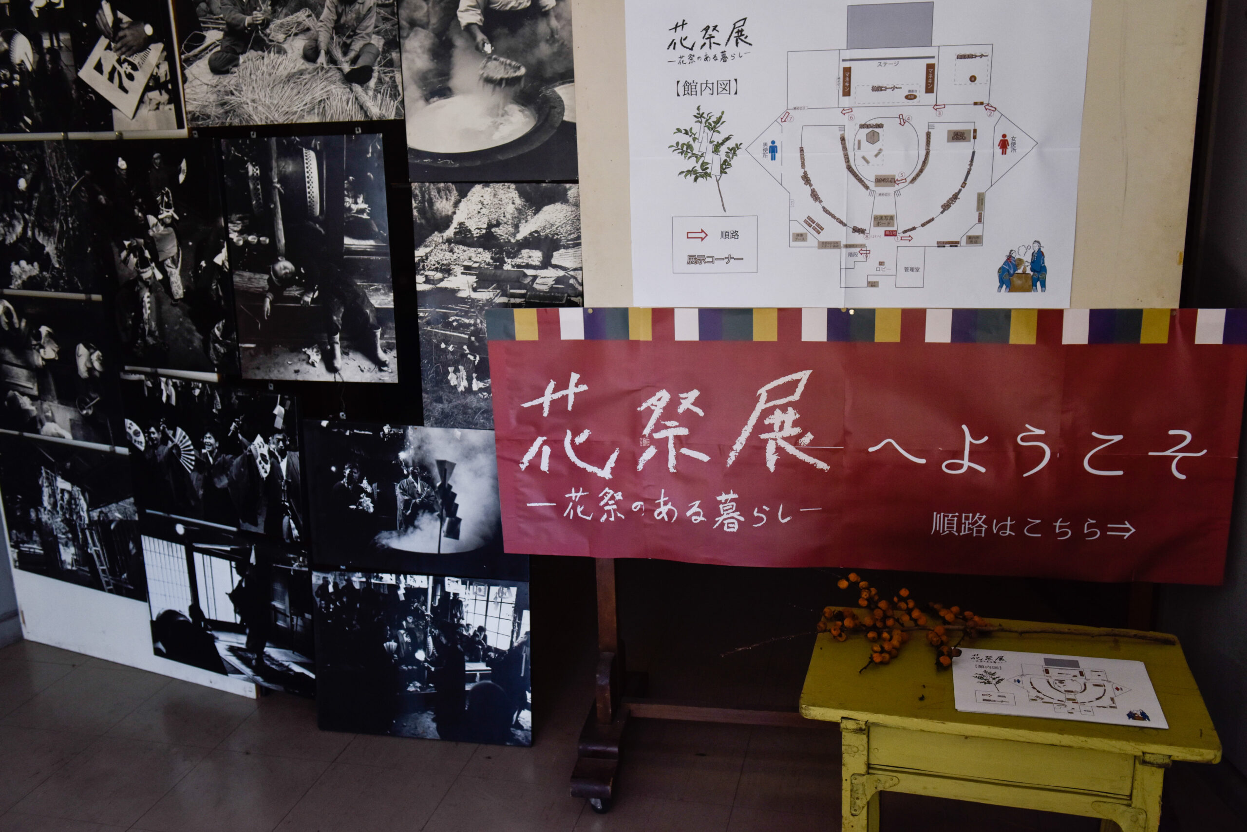 まずは入館料320円を払い中に入ると、「花祭展へようこそ」の文字。花祭会館の1階部分では、2021年11月13日から2022年1月9日まで期間で「花祭展」が開催されている。この展示を拝見して、各地区の花祭に対する理解が深まるような取り組みと感じたので、その一部をご紹介したい。