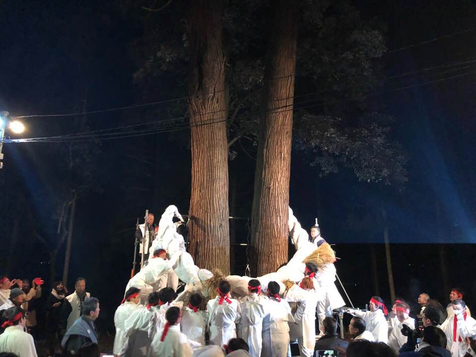数え年42歳を迎えた厄年の男衆達が、大しめ縄を担ぎ、町内を練り歩き、最後は樹齢500年の御神木「夫婦杉」に奉納し、厄払いと1年間の家内安全を祈ります。