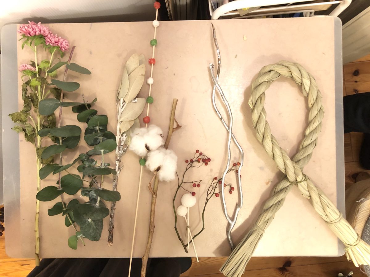 次は、その土台を飾り付けるための、飾り選びです。こちらの教室では、フラワーアレンジメントもされているので飾りとなる材料も豊富!一見、お正月飾りに似つかわしくないように感じますが、いざレイアウトしてみると全くそんなことはありませんでした!