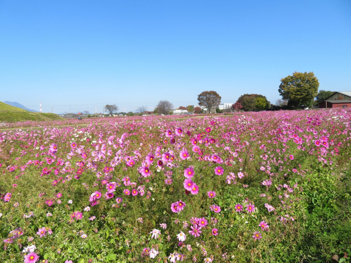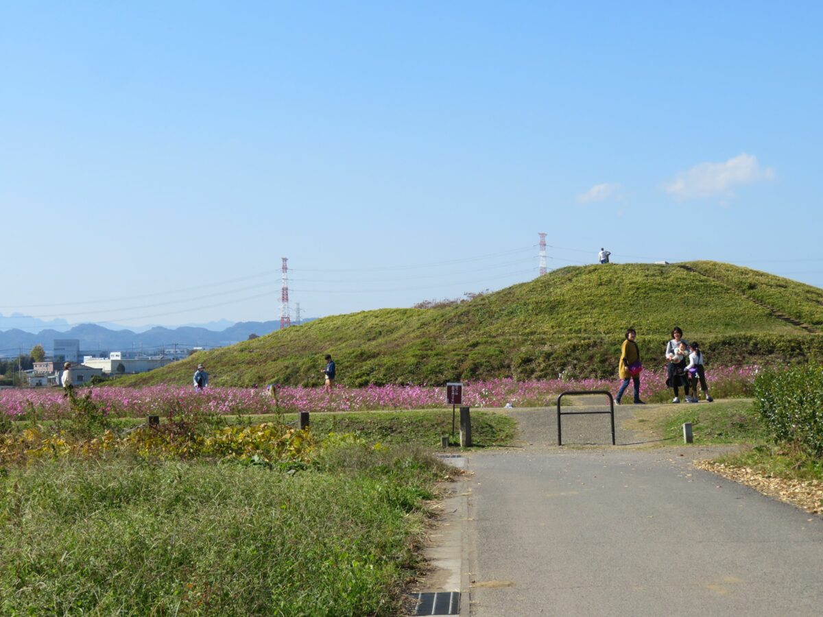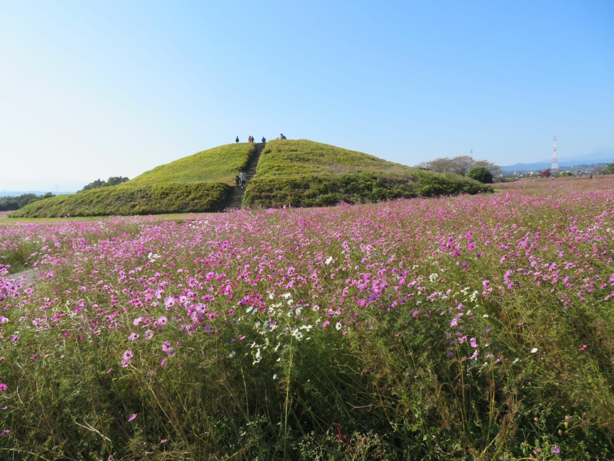 高崎市北部の「はにわの里」には、古墳時代の2つの前方後円墳が復元整備されています。「八幡塚古墳」の南側の「二子山古墳」では、全周を囲むようにコスモスが植栽されます。例年9月下旬から11月上旬にかけて季節の彩りで古墳に眠る古代の豪族の霊を慰めているようです。